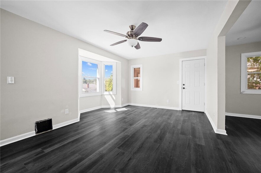 New roof on both the house and two car garage, new electric, new windows, new ceiling fans new front doors total rehab top to bottom new furnace new duck work ,new hot water tank paint , cement work New kitchen with luxury Vinyl Plank through out and new bathroom large rear laundry room set up in basement New refrigerator and stove large yard just move right in