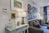 Settle into the heart of Myers Park in this bright 1-bedroom condo on historic Queens Road. Located on the first floor of a beautifully updated mid-century building, this condo is designed for guests who value simplicity, style, and cleanliness. Feel at home in this residence that blends mid-century style with modern comfort. This condo features a fully equipped kitchen with a gourmet gas range, convection oven, full-size refrigerator with ice maker, dishwasher, and complete cookware set. The bathroom offers a walk-in shower with dual shower heads, double sinks, and heated marble floors. The living area includes mid-century furnishings, a large smart TV with Hulu + Live, and abundant natural light streaming through oversized windows. A stackable washer and dryer are in the unit. The dining area seats four comfortably for meals or workspace. The residence features original works by Charlotte artist Nico Amortegui. Enjoy ultra-fast Wi-Fi and Hulu + Live TV. On-site parking is available in a private lot directly beside the building. A workstation with a monitor, keyboard, and mouse is available for $10 per day. A pack ’n Play or highchair is available with 24-hour notice. Dogs are welcome with a fee of $59 per dog, or $120 if unregistered. Welcome to Myers Park, one of Charlotte’s most beautiful and historic neighborhoods. Designed in the early 1900s by landscape architect John Nolen, the area features winding streets, grand homes, and an abundance of green space. The atmosphere is serene, walkable, and lined with centuries-old willow oaks. Walk to Summit Coffee, Laurel Market, RuRu’s Tacos, or Stagioni for local favorites. Freedom Park and the Greenway are minutes away for walking, jogging, or biking. Uptown Charlotte is 1.5 miles away, a 5–7 minute drive. Atrium CMC & Novant are a 10–12 minute walk. Freedom Park is a 15-minute walk via Greenway. The Light Rail (East/West Blvd Station) is a 10-minute drive, and the airport is 15 minutes by car. Uber, Lyft, and bikeshare options are readily available, but most guests enjoy exploring Myers Park on foot. Quiet hours are from 10 PM to 7 AM. No parties or unregistered guests are permitted. Smoking and vaping are not allowed, and a $500 cleaning fee applies for violations. Keep pets off furniture; additional cleaning fees may apply. Air conditioning must remain between 72 and 75 degrees in the summer and 68-72 in the winter and on AUTO to help ensure it stays in good working condition during your stay. Keep doors and windows closed as much as possible. [SI]