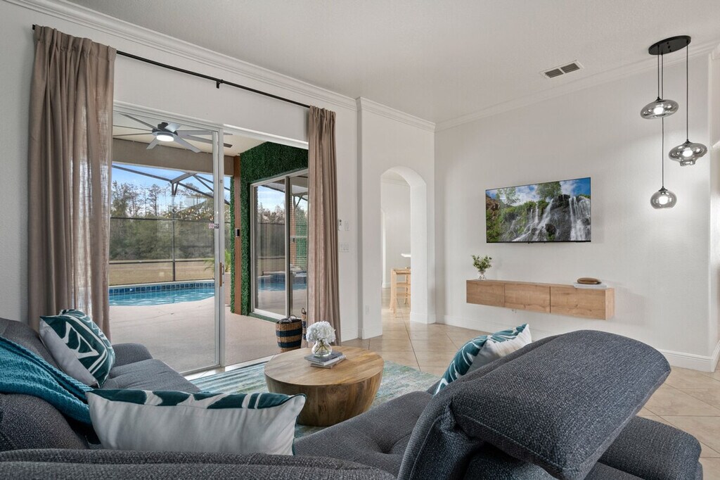 The advertised rate of $7,605/month is the lowest available price, based on a 30 day(s) stay with a move-in date of October 25, 2026. Rates vary depending on the duration of stay, season, and other parameters. For exact pricing and additional pricing components, please visit our website and enter your desired move-in and move-out dates. The rate is applicable when billed upfront; it can be higher if billed in multiple payments. Escape to this 4-bedroom home in a peaceful Davenport golf community, just minutes from Disney, and feel at home. This home is designed for fun, comfort, and connection, creating unforgettable family memories. This home features an Avatar glow-in-the-dark movie theater with a 100” TV, sound bar, and 5 reclining chairs, and an Avatar-themed game room with glow-in-the-dark murals and an indoor putting green. The fully equipped kitchen has all the essentials for family meals, and the open living area offers comfortable seating and a smart TV. Enjoy the in-unit washer and dryer, and central A/C and heating for year-round comfort. Enjoy the private pool and spa with a screened lanai, and a mounted outdoor screen for night use. A free BBQ grill and outdoor patio seating are available. Pool heat is available for an additional fee. Up to 2 dogs are welcome for a pet fee of $150. Located in the well-established Highland Reserve Golf Community, this home is known for its quiet streets, open green spaces, and relaxed residential feel. Guests can enjoy beautiful golf course surroundings, perfect for morning walks or evening strolls. The community features sidewalks, open parks, and playground areas, making it ideal for families and those who enjoy the outdoors. Highland Reserve is centrally located, providing easy access to grocery stores, restaurants, golf courses, and everyday essentials just minutes away. Its convenient location also allows for a smooth drive to Disney, Universal, and SeaWorld, without the congestion of resort-style communities. Guests are responsible for refilling the BBQ propane tank as needed during their stay. It is recommended to keep pets leashed outside, crate them if left unattended, and be sure to clean up after them. [SI]