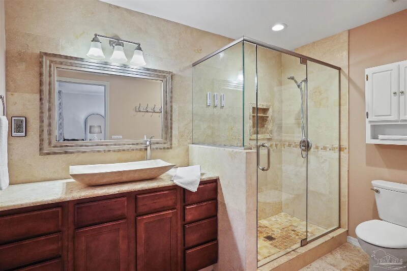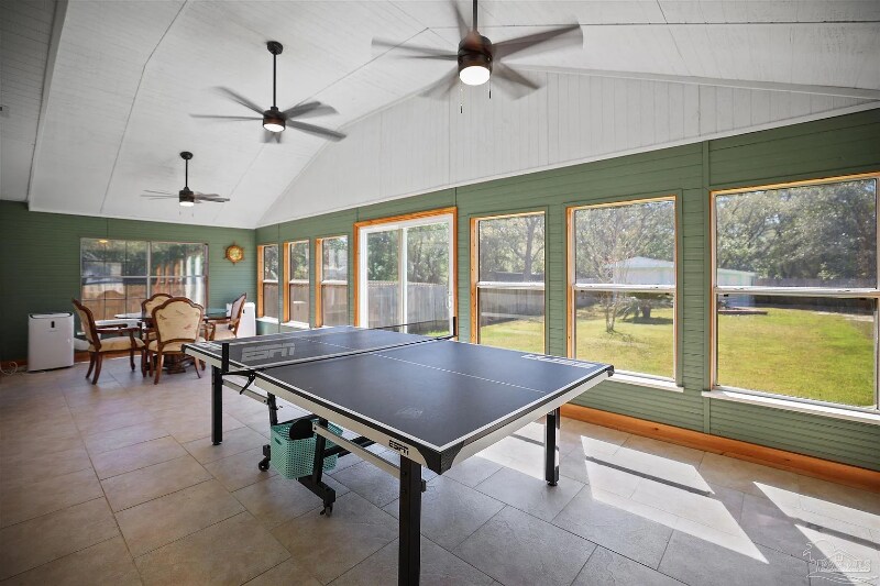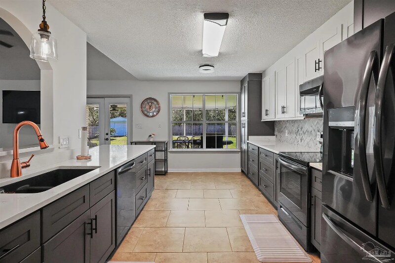Property Id: 2143856 FULLY FURNISHED....Nestled in the heart of Gulf Breeze, this beautifully updated 5-bedroom, 2.5-bath residence offers an ideal blend of style, space, and serenity — all just minutes from the beach. From the moment you arrive, you're greeted by a manicured front yard with tropical landscaping, a welcoming covered porch, and timeless curb appeal. Step inside to discover a completely remodeled kitchen that will impress any home chef — boasting sleek two-tone cabinetry, quartz countertops, modern herringbone tile backsplash, black stainless appliances, and a bold copper pull-down faucet at the oversized undermount sink. Entertain effortlessly with a spacious open floor plan that flows into a large sunroom, flooded with natural light and framed by gorgeous picture windows — perfect for game nights, morning coffee, or indoor-outdoor dining. The primary suite is a relaxing retreat with plush carpeting, crown molding, and direct access to the sunroom.