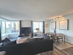 Beautiful corner two-bedroom residence offering over 1,445 square feet of living space. The thoughtfully designed floor plan features a split-bedroom layout, providing complete privacy for both bedrooms. The expansive living and dining area showcases hardwood floors and dramatic oversized windows that frame stunning city skyline views. An open-concept kitchen features a large island-perfect for meal prep and entertaining-along with sleek new gunmetal gray appliances. The spacious primary suite offers two large windows and an impressive, oversized walk-in closet. The primary bath includes a large vanity with storage, new lighting and a relaxing soaking tub/shower combination. The second bedroom is generously sized, easily accommodating a queen-size bed, and features a full wall of closets. Additional highlights include an in-unit washer and dryer for added convenience and an abundance of living space ideal for everyday comfort and entertaining. This full-service building offers 24-hour door staff, an exercise room, entertainment suite, on-site management, and on-site maintenance. Ideally located close to everything Streeterville has to offer-restaurants, grocery stores, and just minutes from Northwestern Medical Campus. Rental Parking Available. Available March 1,2026