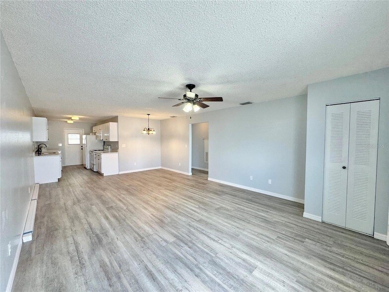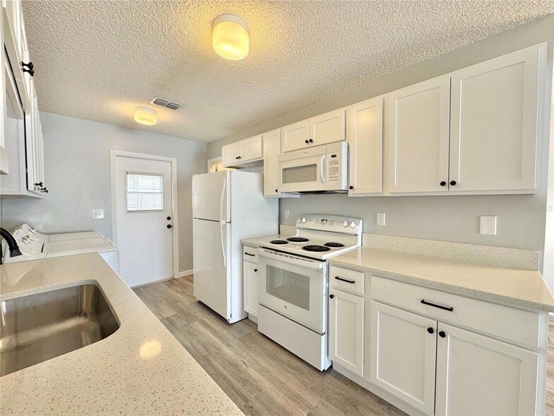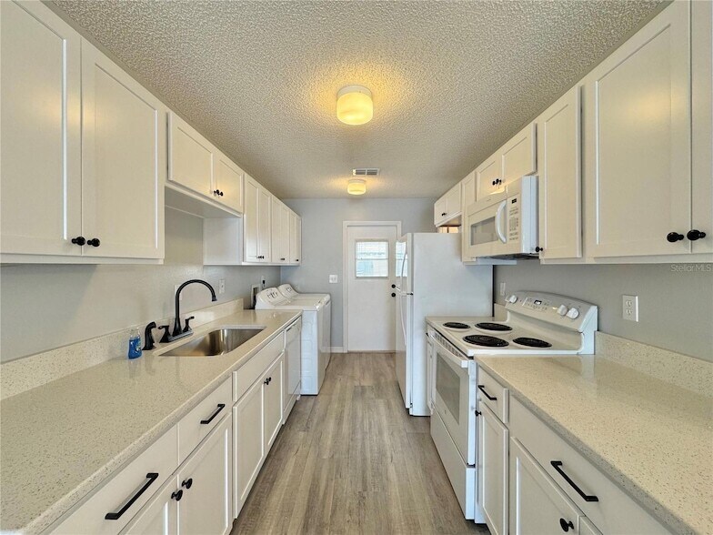 This fully remodeled unit boasts brand new vinyl plank flooring throughout, elegant granite countertops in both the kitchen and bathrooms, as well as updated mirrors and fixtures. The freshly painted interior complements the open great room, which seamlessly blends the living and dining areas. The galley kitchen is equipped with all appliances, including a washer and dryer, ample counter space, and a walk-in pantry providing additional storage space. The primary bedroom is generously sized with a walk-in closet and a private en-suite bathroom boasting stunning granite vanity and walk-in shower. Enjoy dual access to the screened-in lanai from both the primary bedroom and the kitchen. The second bedroom offers spacious accommodation with dual closets and easy access to the guest bathroom with tub/shower combination. Residents have access to community amenities including a heated pool and fishing dock with direct lake access to the Chain-of-Lakes (Lake Smart). The location offers easy access to Highway 27 and I-4, connecting you to Orlando and Tampa.
