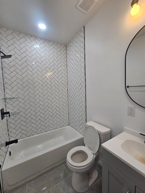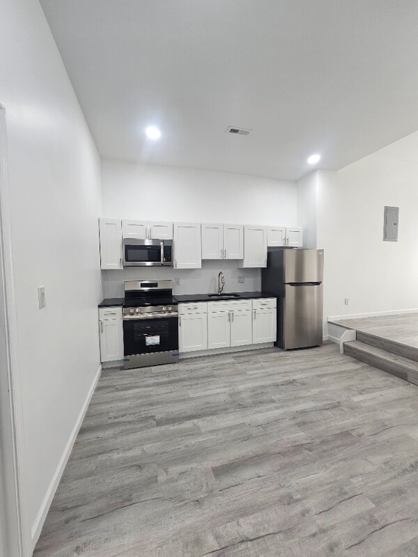 Property Id: 2399506 Welcome to this beautifully renovated apartment featuring sleek, contemporary upgrades throughout. From the moment you walk in, you’ll appreciate the open layout, high ceilings, and wide-plank gray flooring that creates a bright, airy feel. The kitchen is outfitted with stainless steel appliances, modern cabinetry, and clean-lined finishes that blend style and functionality. Recessed lighting throughout the home adds warmth and a polished touch. The bathroom is a true standout, showcasing a stunning floor-to-ceiling herringbone tile surround, matte black fixtures, a soaking tub, and a modern vanity with updated lighting. The spacious bedroom offers large windows for natural light, generous wall space, and a clean, minimalist aesthetic ready for your personal touch. Perfect for tenants seeking a move-in-ready space with modern design and low-maintenance living.