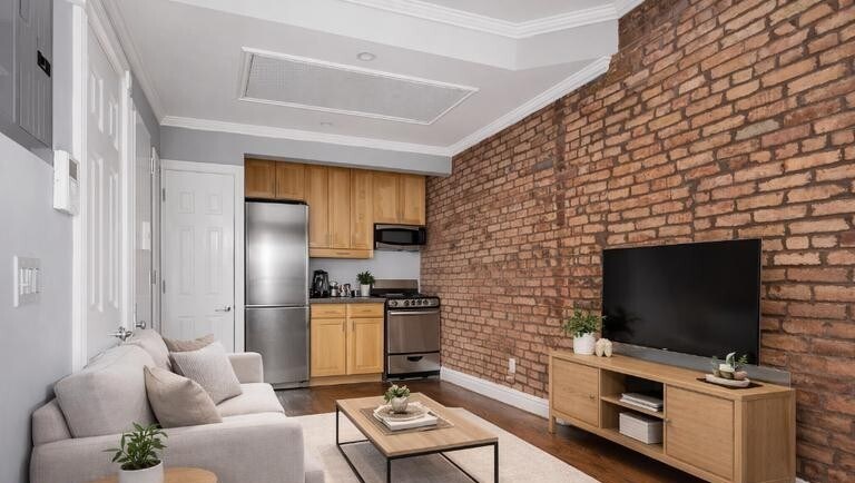 Welcome to your new home! This beautifully designed one-bedroom apartment offers the perfect balance of style and comfort. The hardwood floors throughout add a warm and polished touch to the entire space.The modern kitchen features custom cabinets and generous counter space, making meal prep a breeze. The living area is expansive, offering plenty of room to relax, entertain, or create a dedicated workspace. The bedroom comfortably fits a queen-sized bed and comes with ample closet space for all your storage needs. The renovated bathroom includes a sleek shower/tub combo for added convenience.At Real New York, were redefining the moving experience with a team of experts who truly understand the NYC market. With over 1,000 exclusive listings and access to 100% of available apartments, were committed to helping you find your perfect homewhether in a full-service building or a charming walk-up.Fees includes $20 application Fee, 1 months rent, and 1 month security deposit.