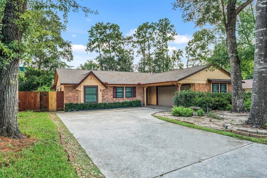 Inviting one-story home with 3 bedrooms and 2 full baths plus loads of storage! The primary suite includes a flex space ideal for an office, nursery, or sitting room, along with a bath featuring dual sinks, a walk-in shower, a bench, and handrails. The kitchen shines with granite counters, tiled backsplash, abundant cabinets, a large walk-in pantry, a breakfast area, and a built-in bar connected to the dining area. The living area offers a gas/wood-burning fireplace, built-ins, and high ceilings. Wood floors flow through the living spaces with brick/tile in the kitchen, baths, and utility. Step outside to a screened-in patio and fenced backyard. Recent updates include roof (2021), garage door/opener (2022), fence, disposal, and stove/oven (2025), with exterior paint planned for 2025. Mature trees blanket this lovely neighborhood with quick access to I-45 and The Woodlands. Book your showing TODAY!