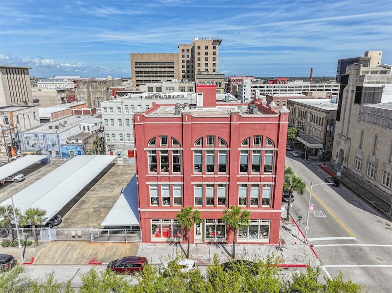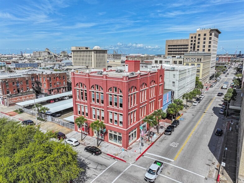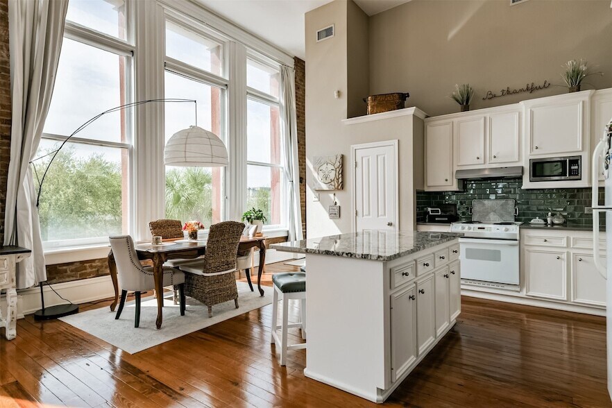 DOWNTOWN GALVESTON LIVING AT ITS FINEST!! Luxury living in the gorgeous, historic Galveston Telephone Company Building built in 1896. The building is listed on the National Register of Historic Places! Unit #4 is a 1/1, has 15' ceilings and sits on the corner which gives you tons of natural lighting with its wrap-around windows! Character abounds with the brick walls and original red pine hardwood floors. A murphy bed in the area currently used as an office gives additional sleeping area. There is also an adjacent, covered parking area that is gated and provides two assigned spaces for the unit. Storage area on main floor as well as a bike rack. Being offered furnished or unfurnished for an additional small charge. As an extra bonus, cleaning service is being provided once a month!