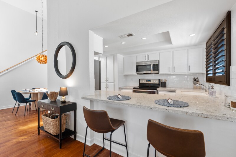 Property Id: 2390923 Rarely available Triple Crown fully furnished corner unit walking distance to the beach from Love Living Management! This upgraded 3-bed, 2-bath home features the community’s largest floor plan with no neighbors above or below, offering the privacy and feel of a detached home. Inside, enjoy vaulted ceilings, hardwood floors, plantation shutters and abundant natural light throughout. The renovated kitchen with granite countertops offers bar seating and includes all stainless steel appliances. The primary suite features a remodeled bathroom with dual sinks, a walk-in custom closet and direct access to a private patio. The guest bath has also been updated with a pedestal sink and shower/tub combo. Additional highlights include a stunning floor-to-ceiling fireplace, custom built-ins, separate laundry closet, along with central heat and air. Also included is an oversize, attached one-car garage with storage and a second assigned parking space. Ideally located west of I-5, you're walking distance to the Del Mar Race Track, Fletcher Cove, Dog Beach, and Cedros Design District, and just minutes from Del Mar Village. We can rent for either long-term or multi-month stays. Ask us about availability. We can book you directly on our website. Furnishings include towels, linens, starter pack of soaps and fully equipped kitchen.