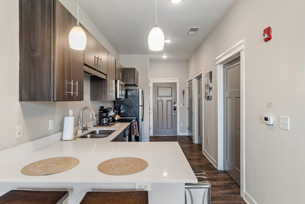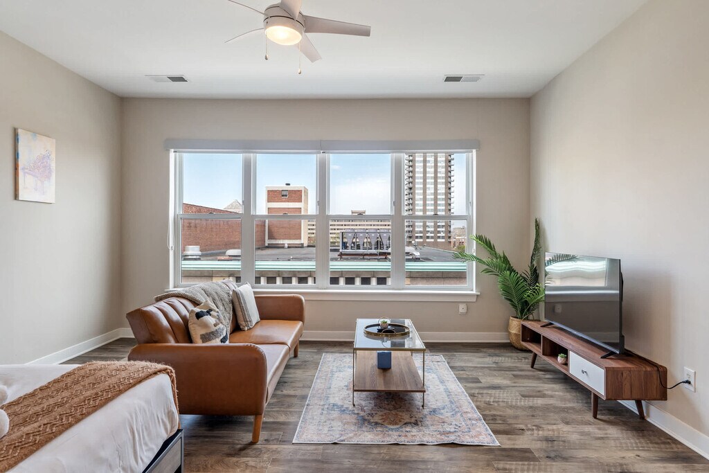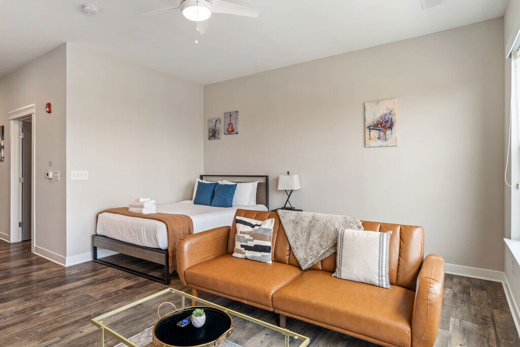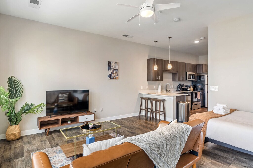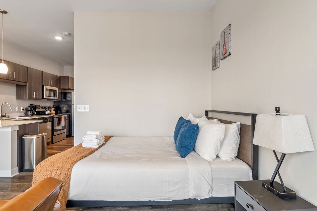 Welcome to our newest condo in the heart of Mass Ave! Designed for the modern traveler, this apartment offers seamless check-in, thoughtful amenities, and a tech-first approach, ensuring you feel at home while living like a local. Located in the local's favorite neighborhood, you're steps away from fantastic bars and restaurants. Enjoy the exclusive lounge or stunning city views from the roof deck. This studio apartment features inviting living areas, a fully equipped kitchen, and a bathroom complete with toiletries. You can also enjoy an outdoor pool, fitness center, in-unit washer and dryer, smart TV with streaming apps installed, and complimentary coffee. Pets are welcome with a maximum of two pets allowed, weighing a combined 40lbs. No Pit Bulls or Bull Mastiffs are permitted. An additional pet fee of $100-300 is based on the length of stay and is collected separately. We offer a variety of optional services to enhance your stay, such as mid-stay cleanings and early check-in or late checkout when available, with additional fees applying. Located in the heart of the vibrant Mass Ave Cultural District, this area is known for its walkability, eclectic dining, art galleries, theaters, and boutique shopping. With a lively atmosphere and historic charm, it's the perfect spot to explore the best of downtown Indianapolis—all just steps from your door. Indiana Convention Center is 0.3 miles away, Lucas Oil Stadium is 0.5 miles away, Old National Centre is 0.6 miles away, Phoenix Theatre is 0.7 miles away, and Saint Mary's Catholic Church is 0.6 miles away. All properties are smoke-free environments. Any sign of smoking is a violation of the stay agreement, which may result in immediate termination and recovery fees beginning at $500. Check-in is at 4 PM and check-out is at 11 AM, with a $75 per hour late fee. There is a $200 penalty for removing smoke detectors and a $200 penalty for lost key fobs. No outside guests are allowed without permission. Guests must agree to not disturb neighbors at all times during the stay and observe quiet hours from 9 PM to 8 AM each day. The home is proactively monitored with decibel sensors for compliance with this noise policy. Long-term stays of 30 days or more will be subject to a background search and credit check. A valid photo ID is required to complete the booking. The minimum age requirement for the primary person booking is 22 years old for out-of-town guests and 25 years old for local guests. No weapons or drugs are allowed, and police will be called for violations. The apartment is wheelchair accessible. The unit is equipped with a smart lock, so you can check in and out with ease using a personalized access code. Enjoy complete privacy in the space, with 24/7 customer service ready to assist you by phone during your stay.