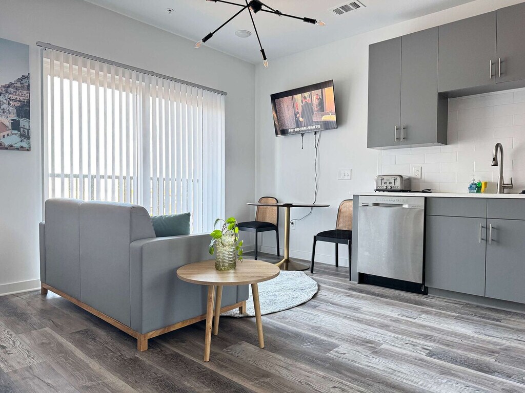 Feel at home in this newly built condo in Atlanta's vibrant Old Fourth Ward. This modern 1-bedroom apartment offers a comfortable retreat, ideally situated for exploring the city's highlights. This apartment features a cozy bedroom with a queen-size bed, a full bathroom with a shower/tub combination, and a modern, fully equipped kitchen. The living area includes a plush sofa and a large flat-screen smart TV. A coffee machine with coffee, cream, and sugar is provided. BYRD scooters are available for rent on every street corner, and there is a 12-minute walk to the Atlanta BeltLine Eastside Trail. Located just 1 mile from Midtown and Emory University Hospital Midtown, this apartment is also a short 7-minute drive to Georgia State Capitol and downtown Atlanta. Enjoy close proximity to popular sites like Ponce City Market, Fox Theatre, World of Coca-Cola, the Aquarium, Mercedes-Bens Stadium, and Olympic Park. Easy access to public parks and fast transportation options make city travel convenient. The Marta Station North Avenue is 1 mile away, and the train takes 25 minutes to the airport. You are also a 5-10 minute Uber or Lyft ride from anything Downtown or Midtown. Check-in time is after 4PM, and check out is by 10AM. Quiet hours are between 9PM and 9AM, and any complaints for loud behavior during these hours will result in being asked to vacate the apartment. [SI]