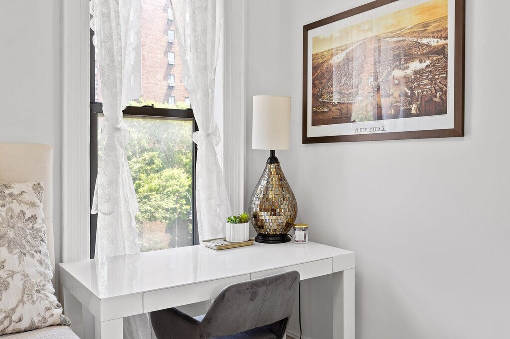 Feel at home in this bright and cozy corner 2-bedroom, 1-bathroom apartment located in the heart of East Village at the corner of E14th Street and Avenue B. This charming apartment features a separate sunny living room and an eat-in kitchen, providing an abundance of natural light. The apartment is situated on the fourth floor of a walk-up building, offering a unique New York City experience. Laundry services are conveniently located next door, with free pick-up and drop-off and self-service available until 8 PM. Major transportation options are just steps away, and the best areas of downtown Manhattan are within walking distance. Designed with comfort in mind, this apartment boasts a corner north-east exposure, allowing plenty of natural light to fill the space. The living room is situated between the two bedrooms, creating a cozy atmosphere. The eat-in kitchen is fully equipped with modern appliances, including a Nespresso machine, milk frother, Magic Bullet, and microwave, making it perfect for home-cooked meals. Located at 14th Street and Avenue B, this apartment is right across from Stuyvesant Town and just steps away from the L train, all 14th Street buses, Trader Joe’s, and Target. The neighborhood offers a vibrant lifestyle with easy access to major transportation and the best areas of downtown Manhattan. The apartment is located on the fourth floor of a walk-up building, requiring residents to climb four flights of stairs. The entire apartment is accessible to guests. Both the queen-size and full-size bedrooms are equipped with their own work-from-home set-ups, including workstations and closets, making it ideal for remote work. [SI]