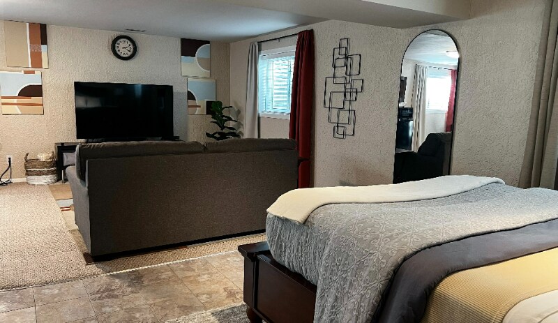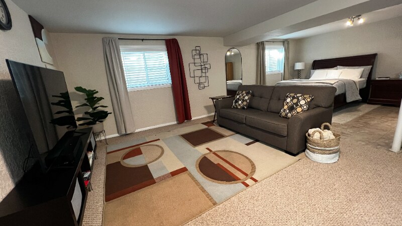 Property Id: 2038866 Private, spacious basement suite ideal for solo travelers and working professionals. This open-plan retreat includes a queen bed, dedicated workspace, kitchenette, walk-in closet, and private bathroom. Reserved driveway parking, easy freeway access, and a quiet neighborhood make this a comfortable place to settle in. Designed for both rest and productivity, the suite features a 65” Smart TV, cozy living area, desk with printer, mini-fridge, microwave, coffee/tea bar, and a small fitness nook. Your private bathroom is located just up a few steps on the lower level and is exclusively for your use. Guests have private access to the entire basement suite and are welcome to use the shared main-level kitchen, laundry room, and backyard patio. This is an owner-occupied home that offers a peaceful, respectful shared-living environment with an emphasis on clear communication. During winter, the driveway is plowed, and you may be asked to briefly move your vehicle.
