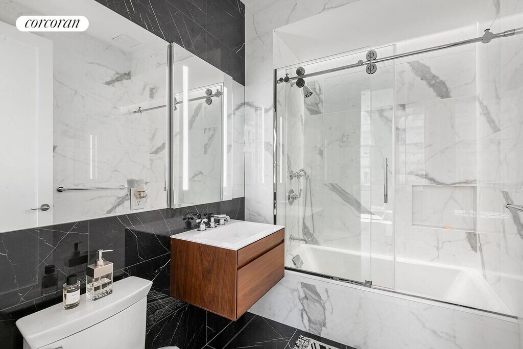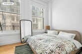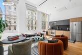 2-Bedroom / 2-Bathroom LoftThis stunning apartment boasts a charming corner living and dining area adorned with 6 expansive arched windows (approximately 8 feet tall). The open kitchen is equipped with top-of-the-line Bertazzoni appliances including a gas range, dishwasher, microwave, and refrigerator, complemented by custom Scavolini cabinetry featuring honed black mist granite countertops. The bedrooms are strategically split for optimal privacy, both offering delightful views over Reade Street. The primary bedroom comfortably accommodates a king-sized bed and includes an ensuite bathroom, while the second bedroom comfortably fits a queen-sized bed, both with generous closet space. Bathrooms are elegantly finished with Nero Marquina and Statuario Bianco porcelain stoneware, Waterworks hardware, Robern medicine cabinets, and either a spacious glass-enclosed shower or a shower/tub combination. Additional features of the apartment include lighting by Artemide, central air and heat, hardwood floors, solar shades on all windows, and a Bosch washer/dryer.