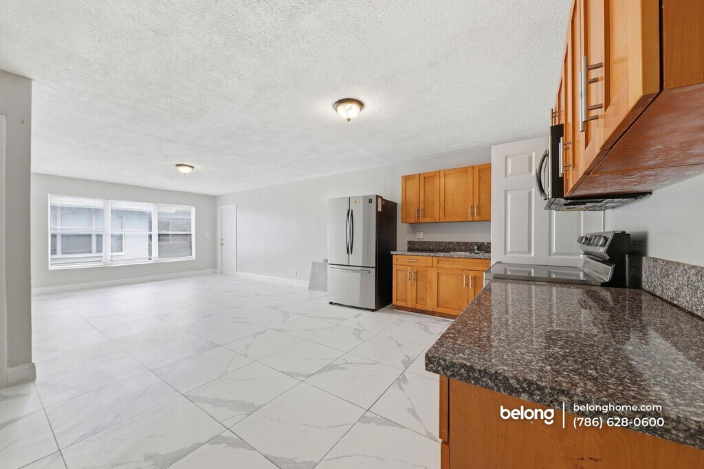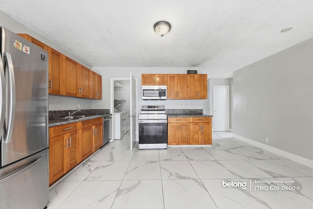 Bright space, bold tile flooring, and an open layout give this 3-bedroom, 2-bath home an inviting presence the moment you enter. Large-format tile stretches across the living and dining areas, creating a clean, cohesive foundation that feels fresh and easy to style. Wide windows welcome natural light, while the open arrangement keeps the main gathering areas connected and flexible for daily living or hosting friends. The kitchen stands ready for action. Warm wood cabinetry provides generous storage, while stainless steel appliances - including a refrigerator, oven range, and microwave - deliver dependable functionality. Spacious counters support meal prep, quick breakfasts, or late-night snacks. Everything sits within easy reach, creating a practical workspace that keeps cooking efficient and organized. Location keeps daily errands simple. Grocery shopping is convenient with options such as Presidente Supermarket and Sedano’s nearby, while dining spots along NW 27th Avenue offer a variety of local favorites. Outdoor recreation awaits at nearby Charles Hadley Park and Arcola Lakes Park, and downtown Miami, Wynwood, and the airport remain within a short drive. This central setting keeps the city’s best destinations close at hand. *Our homes come as-is with all essentials in working order. Want upgrades? Request it through the Belong app, and our trusted pros will take care of the rest!