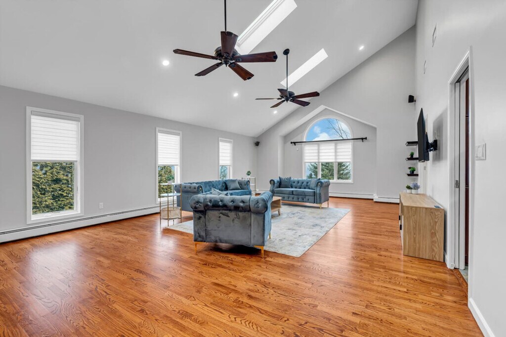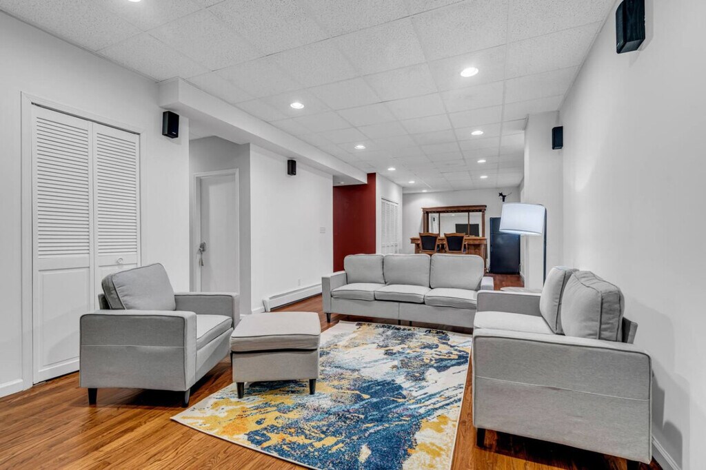 Feel at home in this home perched high atop the mountains of Stony Point, NY, offering breathtaking views. This home features five bedrooms and four bathrooms. This home features six large flatscreen TVs, free high-speed Wi-Fi, an outdoor kitchen with a BBQ grill, an outdoor fire pit, a fully stocked laundry room, a cozy basement theater and games, and an outdoor basketball hoop and toys. The chef’s kitchen boasts rich cherry wood cabinetry and updated appliances, including a 6-burner stove, oven, microwave, dishwasher, LG refrigerator with ice dispenser, and a wine cooler. The laundry room is fully equipped with a washer and dryer, detergent, an iron, and a utility sink. Pack and plays are available upon request. Ask about cleaning services during your stay. Located a 50-minute drive from MetLife Stadium, this home offers views from the front and backyard. The entryway features skylights, and the living room has soaring ceilings and large windows to take in the mountain vistas. The outdoor kitchen features a 6-burner Weber grill, ideal for al fresco dining. This home is located in a residential area; therefore, there is a strict no-party rule in place. No loud noise is allowed after 9 pm. Please be considerate of the neighbors and do not park on the road. No smoking is allowed and there will be a $500 penalty if violated. Lost keys will incur a $175 penalty fee. Early check-in or late check-out that is unauthorized will incur a $300 penalty fee. Outside guests are not allowed without prior approval. Unauthorized use of the home will result in immediate removal without a refund and guests will be held liable for any damage. No loud noise is allowed from 9pm-9am. Includes free high-speed Wi-Fi. [SI]