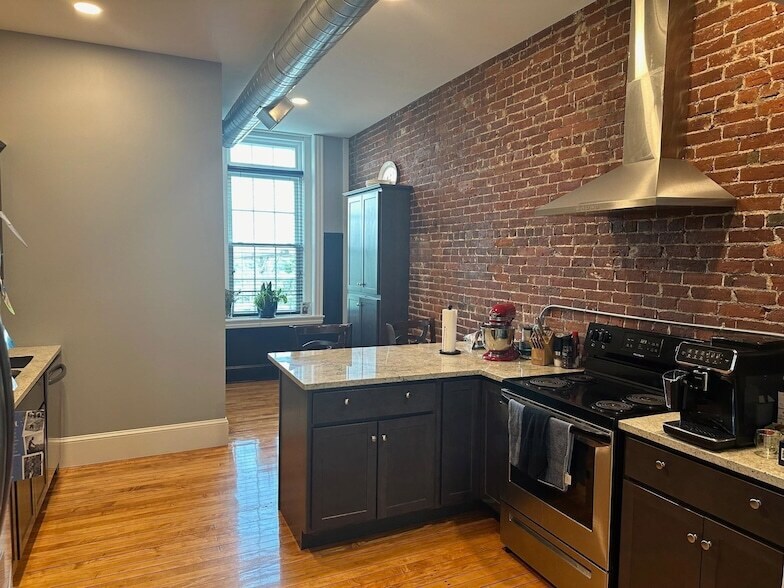 Welcome to 60-64 High St. in historic downtown Somersworth! This unit is easily described as distinctive, divergent, in a class of its own... There is nothing else like this outside of a sophisticated Metropolitan. The great room is an entertainer's dream, and the wide open loft area is fit for an artist or whatever else your vision inspires. From the beautiful hardwoods, exposed ductwork, original brick walls, wire rails, granite countertops, and nearly floor-to-ceiling windows, there is no lack of beauty or uniqueness in this apartment. Perfect kitchen for a passionate home chef, equipped with high-end appliances and ventilation.