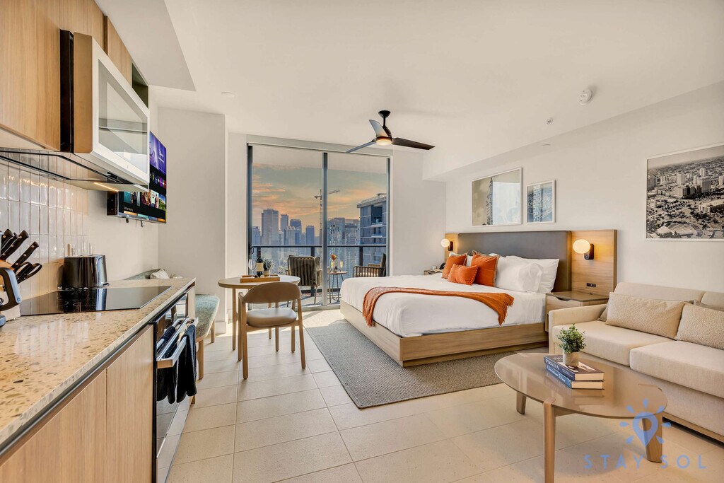 Welcome to your chic downtown retreat! Feel at home in this stylish studio apartment. This modern studio apartment is designed for both comfort and convenience and boasts a plush king-size bed and a TV for your relaxation. Enjoy the convenience of a full kitchen, ideal for preparing meals, and a full bathroom with all the essentials. Additional amenities include a washer and dryer inside the unit, making your stay even more comfortable. Step outside to your private balcony for stunning city views. Enjoy access to an amazing pool and a well-equipped gym. A free pack n play is available upon request. Pets are welcome with a fee of $100 per dog, with a 30 lbs restriction (doesn’t apply to esa). Parking is not included. Downtown Miami is a vibrant urban area known for its dynamic cultural scene, modern architecture, and bustling nightlife. It’s a hub of business and entertainment, featuring attractions like the Miami Art Museum, Bayfront Park, and the American Airlines Arena. The neighborhood is characterized by its sleek skyscrapers, upscale dining, and diverse events, making it a central spot for both locals and tourists. Getting around Downtown Miami is convenient with several options, including the Miami Metromover, Metrobus, Metrorail services, taxis, rideshares like Uber and Lyft, and bike rentals. There may be an increase in daytime noise levels due to nearby construction. Swimming is at your own risk; there is no lifeguard on duty, and children must be supervised by a responsible adult at all times. For your safety, no diving or running is allowed. The property management is not liable for any accidents, injuries, or losses that may occur while using the pool or surrounding areas. Please keep all doors closed and the air conditioning on at all times to help prevent condensation and property damage. [SI]