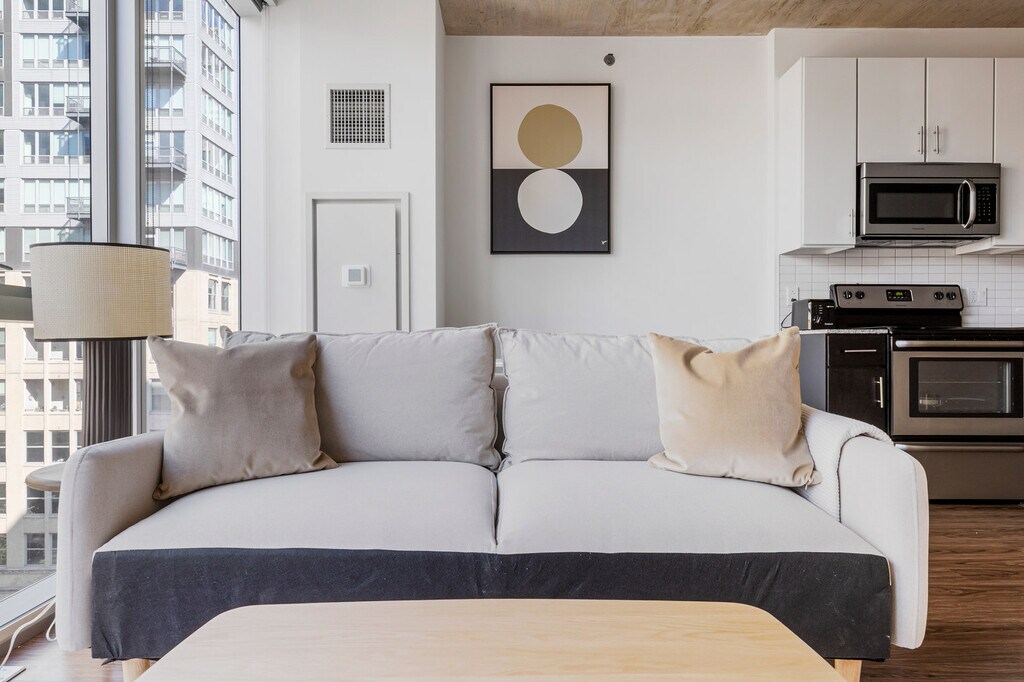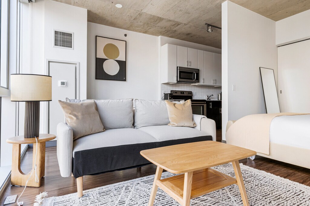 Similar space, but different These photos are of a similar space and style to this apartment. They’re intended to give you a sense of Blueground’s design style. Exact furniture and layout will be different. Be the first to rent! Show up and start living from day one in Chicago with this sophisticated studio Blueground apartment. You’ll love coming home to this thoughtfully furnished, beautifully designed, and fully equipped West Loop Gate home. (ID #CHI1309) The advertised rate of $2,890/month is the lowest available price, based on a 12 month(s) stay with a move-in date of December 21, 2025. Rates vary depending on the duration of stay, season, and other parameters. For exact pricing and additional pricing components, please visit our website and enter your desired move-in and move-out dates. The rate is applicable when billed upfront; it can be higher if billed in multiple payments. Brokers are welcome to reach out. Were you looking for an unfurnished lease? Try Blueground instead and upgrade from unfurnished to furnished living: - Furnished at rates comparable to unfurnished - No setup or furniture costs - save thousands - Move-in ready - save time, just bring your suitcase Designed with you in mind As with any Blueground apartment, you’ll find a thoughtfully designed space complete with beautiful furniture and a fully equipped kitchen in this studio property. And, thanks to our superior quality mattresses, luxury linens, and towels, you can relax knowing you’ll always feel comfortably at home. When you’re ready for some fun, you can take in the Chicago vibes or bring the entertainment to you with the premium wireless speaker or smart TV. This apartment also offers in-apartment laundry. Sleeping arrangements Queen Bed, 63in/160cm Amenities Building amenities unique to this studio apartment include an on-site: - BBQ Area - Doorman - Dryer - Elevator - Swimming pool - Washing machine - Pets allowed Arrival and ongoing support The entire apartment is yours to enjoy! Throughout your stay, you’ll have access to our Client Experience team through the Blueground App. You can schedule additional cleanings, submit maintenance requests, and view our neighborhood recommendations with just a few taps. We’ll share all details upon confirmation of your stay. Other things to note Building amenities may have an extra cost. Photos are from a similar property. This Blueground apartment has flexible lease options, allowing you to book it for one month, a year, or more. Pets are welcome, though weight limits and breed restrictions apply and may incur fees. Also note - This apartment is in close proximity to a fire/police station, so you can expect noise from time to time - This apartment is in close proximity to a school, so you can expect noise from time to time - This is a guarded building equipped with a doorman/concierge at all times [SI]