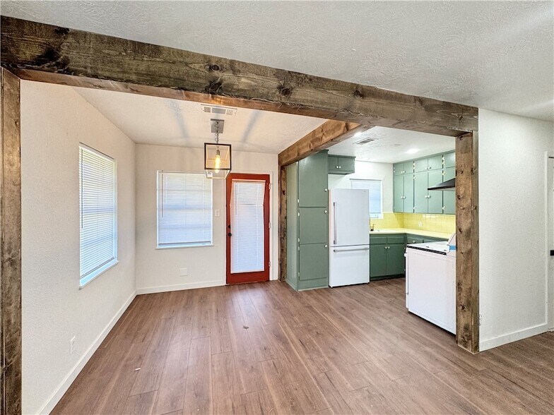 Property has been REHAB and you'll find new flooring, fresh paint, and a brand-new water heater, new HVAC, completely remodeled bathroom. Bathroom features a stunning tile walk-in shower with a clear glass door. The cozy kitchen maximizes every inch, offering a gas stove, refrigerator, and freshly painted cabinetry. Right off the kitchen, you'll find a charming dining area, perfect for family dinners and gatherings. Outside, a spacious backyard with mature towering trees offers a serene escape.