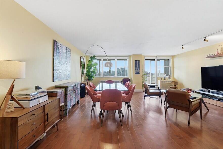 High-floor 1BR with spectacular Manhattan & Hudson River views! Located on the 32nd floor, this spacious 1,000 sq ft home features an open-concept layout, generous storage, and a partially enclosed 200 sq ft terrace perfect for year-round enjoyment. The large living area flows seamlessly into the dining and kitchen spaces, with natural light pouring in throughout the day. The bedroom offers full skyline and river views as well. Set in a full-service building with 24/7 concierge and on-site amenities. ALL utilities included in rent for exceptional value. Parking available for a fee. Move-in ready and close to transportation, shops, and waterfront parks.