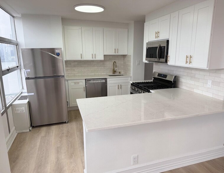Welcome to Tower West on the gem of Boulevard East. This beautifully renovated 2-bedroom, 2-bath home offers approximately 1,400 sq ft of living space with new flooring, updated bathrooms, and a modern kitchen featuring a breakfast counter with seating, perfect for casual dining. The spacious living and dining area is surrounded by oversized windows that fill the home with natural light and offer partial New York City skyline and Hudson River views, along with access to a private balcony. Tower West offers excellent amenities including a gym, outdoor pool, rooftop, and all utilities included in the rent. The NYC bus to Midtown Manhattan stops right outside the building, making commuting easy. Ideally located at 60th Street & Boulevard East, close to parks, restaurants, shopping, and just minutes from the Hudson River waterfront promenade and Edgewater's shopping and dining. Parking available for an additional fee.