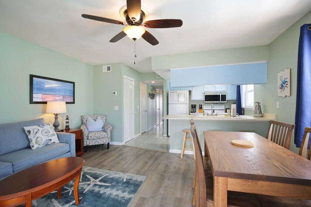 Welcome to the perfect vacation at this top-floor unit with stunning lake views. Just steps to the beach and boardwalk, this apartment features a large living room with a pull-out couch and Roku smart TV. The well-equipped kitchen offers bar seating for three and a dining table for four. Enjoy a restful night's sleep in the queen bedroom and a bunk bed room, accommodating a total of six guests. Relax on the master bedroom balcony and enjoy sunsets, or unwind on the large attached deck with a peek of the ocean. Experience gorgeous lake views and front-row seats for weekly fireworks and movies. This beautiful apartment features tile and hardwood floors throughout, offering a stylish and comfortable space. The large living room includes a pull-out couch and a Roku smart TV for your streaming needs. The ample kitchen is well-equipped for all your cooking needs, with bar seating for three and a dining table for four. The queen bedroom and bunk bed room provide a total sleeping capacity of six. Each unit includes two designated parking spaces. If you’re bringing additional vehicles, public parking is available with enforcement from March 1 to October 31, 9 AM to 8 PM, at rates of $5 per hour or $25 per day. Private parking lots around the boardwalk area typically charge a flat fee ranging from $25 to $60 per day. Golf carts are welcome but count as one of your two parking spaces. Charging golf carts on the property is not permitted. Located right across from Carolina Lake Park and just steps to the beach, this apartment offers easy access to sun and fun. The Carolina Beach boardwalk is only 1/4 mile away, providing dining and entertainment options. Fort Fisher Civil War Historic Site and the NC State Aquarium are six miles to the south, while the US North Carolina Battleship, Downtown Wilmington Riverwalk, and vibrant nightlife are just 25 minutes away. Enjoy local attractions like paddleboats at Carolina Beach Lake and a weekly Farmer's Market on Saturdays. The unit is on the top floor, and the building is elevated due to its proximity to the ocean, requiring a flight of stairs for access. There is no elevator, and the property is not wheelchair accessible. Smoking and pets are not allowed. Quiet hours are observed from 10:00 PM to 8:00 AM to ensure a peaceful environment for all guests and neighbors. Please keep noise to a minimum during this time, especially in outdoor areas and shared spaces. An outdoor shower is provided to rinse off excess sand, as showering off sand in the unit's shower or bath can cause clogs. Housekeeping is not provided, and guests are encouraged to bring their own beach towels. [SI]