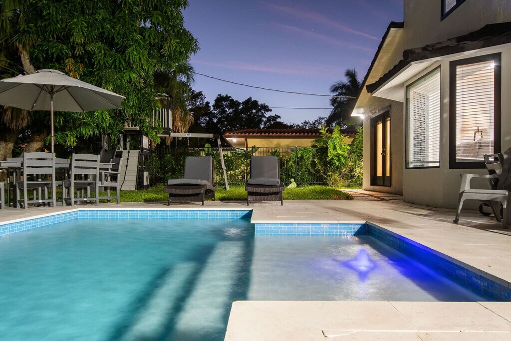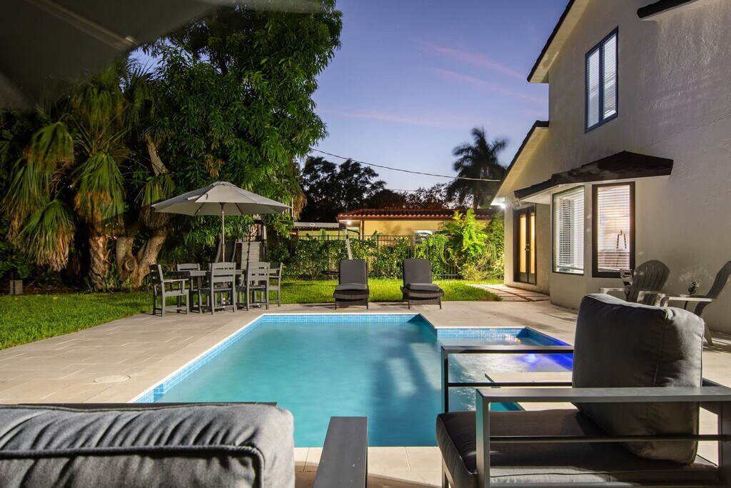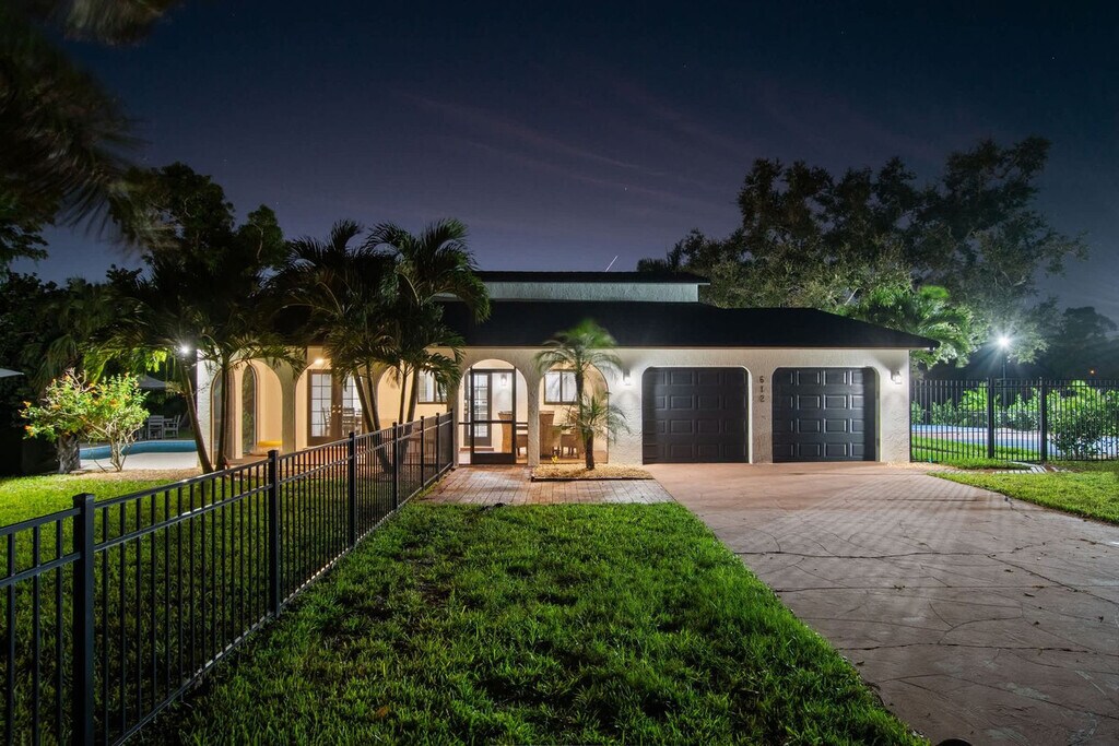 Welcome to your dream oasis in Palma Sola Park! Feel at home in this spacious home that combines Mediterranean charm with modern comforts. It features 4 bedrooms and 3 full bathrooms and is located just an 8-minute drive to the beach. This home offers a private heated saltwater pool with loungers, a BBQ grill, and a spacious backyard. TVs are Roku-enabled with streaming cable and apps. There is also a screened front porch with ambient lighting and a TV, a two-car garage, ample driveway parking, a laundry room with a full-size washer and dryer, and beach chairs. The kitchen is fully equipped with cookware, dishes, and utensils. The open-concept living area is perfect for game nights or movie marathons with comfortable seating and Roku-enabled TVs throughout. Pool heat is available for $35 per night. Located in Palma Sola Park, this home is ideally situated close to beaches, dining, parks, and transport. It's 4.8 miles to Bradenton Beach (approximately 11–13 minutes by car), 5.9 miles to Anna Maria Island Beach (about 13 minutes drive), 0.5 miles to Paradise Bay Plaza (grocery store, restaurants, Starbucks), 10.1 miles to Sarasota–Bradenton International Airport (SRQ) (around a 20-minute drive), approximately 2.5 miles (5–7 minutes) to Bradenton Riverwalk, 30 minutes (˜18 miles) to St. Armands Circle and Downtown Sarasota, and 13 minutes (˜5.8 miles) to IMG Academy. This home is in a residential neighborhood, so please be respectful of the neighbors. Absolutely no prom, graduation, or other large parties/events exceeding the maximum occupancy of 14 guests are permitted. Bradenton quiet hours are from 10 pm to 7 am, during which time noise must be kept below 65 db. A noise detector has been installed in the house to notify you if the sound has reached a level that could disturb the neighbors. A Ring camera is located at the front door. [SI]