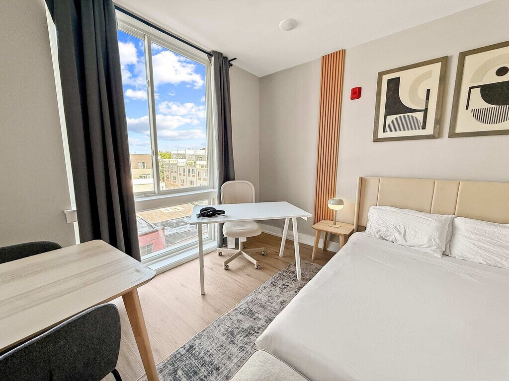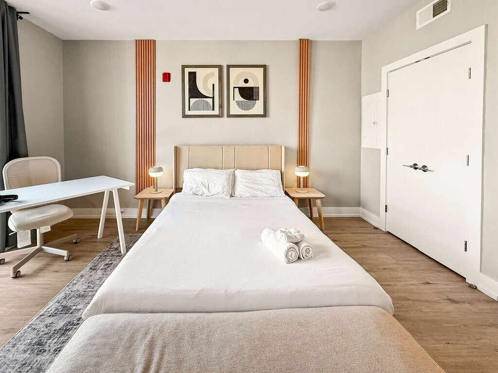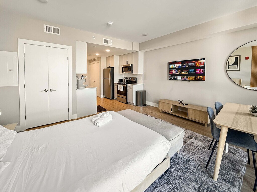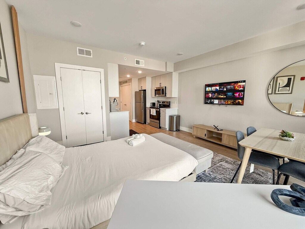 Nestled in a vibrant neighborhood, this charming studio apartment offers a delightful retreat in the heart of the city. Located just steps away from bustling streets and cultural landmarks, this space is ideal for couples or solo travelers seeking a comfortable stay with easy access to the city's attractions. This inviting studio apartment is thoughtfully designed to cater to all your needs for a carefree and enjoyable stay. As you step inside, you'll be greeted by a bright and inviting space, thoughtfully designed for comfort and convenience. The studio features a comfortable queen-sized bed, perfect for a restful night's sleep after a day of exploring the city. Equipped with a comfortable desk and chair to ensure you can work for extended periods without discomfort. The fully equipped kitchen features modern appliances and everything you need to whip up a delicious meal. Enjoy your culinary creations at the dining table. Pets are allowed depending on size. The following additional per pet cleaning fee applies: 1-4 nights: $25 per night, 5-29 nights: $200, and 30+ nights: $300. This apartment's prime location allows you to explore the city with ease. Discover local eateries, trendy boutiques, and cultural attractions just minutes from your doorstep. Whether you're here for business or leisure, this cozy apartment offers a perfect blend of comfort and convenience for your stay in the city. There are surveillance cameras in the hallways for security and a Minut device in the unit for noise level. No shoes are allowed in the house and please do your dishes before leaving. No smoking is allowed. If there is evidence of smoking indoors, a $500 fine will be imposed. [SI]