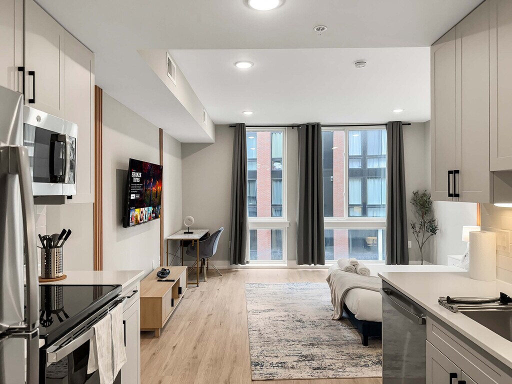 Nestled in a vibrant neighborhood, this charming 1-bedroom apartment offers a delightful retreat in the heart of the city. Located just steps away from bustling streets and cultural landmarks, this space is ideal for couples or solo travelers seeking a comfortable stay with easy access to the city's attractions. This inviting 1-bedroom apartment is thoughtfully designed to cater to all your needs for a carefree and enjoyable stay. Step into the inviting living room, a stylish and comfortable space designed for relaxation and entertainment. The room is tastefully furnished with a plush sofa bed, perfect for sinking into after a day of exploring the city. Enjoy your favorite movies on the flat-screen TV, or simply unwind with a good book in the cozy ambiance. The fully equipped kitchen features modern appliances and everything you need to whip up a delicious meal. Enjoy your culinary creations at the dining table. Retreat to the bedroom, where a comfortable queen-size bed awaits, promising a restful night's sleep. The bedroom also offers plenty of storage space for your belongings, ensuring a clutter-free environment throughout your stay. Pets are allowed depending on size. The following additional per pet cleaning fee applies: 1-4 nights: $25 per night, 5-29 nights: $200, and 30+ nights: $300. This apartment's prime location allows you to explore the city with ease. Discover local eateries, trendy boutiques, and cultural attractions just minutes from your doorstep. Whether you're here for business or leisure, this cozy apartment offers a perfect blend of comfort and convenience for your stay in the city. Surveillance cameras are in the hallways for security and a Minut device is in the unit for noise level monitoring. No shoes are allowed in the house and please do your dishes before leaving. No smoking is allowed indoors, and if there is evidence of smoking indoors, a $500 fine will be imposed. [SI]