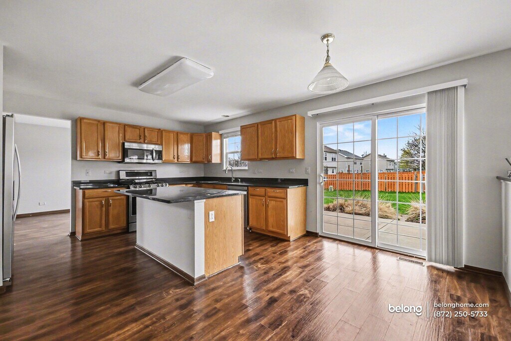A traditional four-bedroom home in Oswego's established residential fabric, offering 2,310 square feet of well-organized space with a handful of features that set it apart from the standard suburban rental. The living room is the home's centerpiece: rich dark hardwood floors run throughout the main level, and a floor-to-ceiling stacked stone accent wall frames a wood-burning stove that gives the space a warmth most homes at this size don't have. Arched doorways connect to the dining area and kitchen, keeping the layout open without sacrificing definition. The kitchen works around a central island, dark granite countertops, and honey-toned cabinetry with a clear sightline to the backyard through generous windows. Upstairs, four bedrooms provide room to grow, each carpeted and naturally lit. The secondary bedrooms are well-proportioned with solid closet space, and the 2.5-bath count handles morning routines without friction. Out back, a wide, fenced yard with a large lawn gives kids and pets real room to use. The neighborhood sits close to the Route 34 corridor, putting Sam's Club, Walmart, Best Buy, and Lou Malnati's within a few minutes. Rush Copley Medical Center and Oswego East High School are both nearby, rounding out the practical appeal of the location. *Our homes come as-is with all essentials in working order. Want upgrades? Request it through the Belong app, and our trusted pros will take care of the rest!