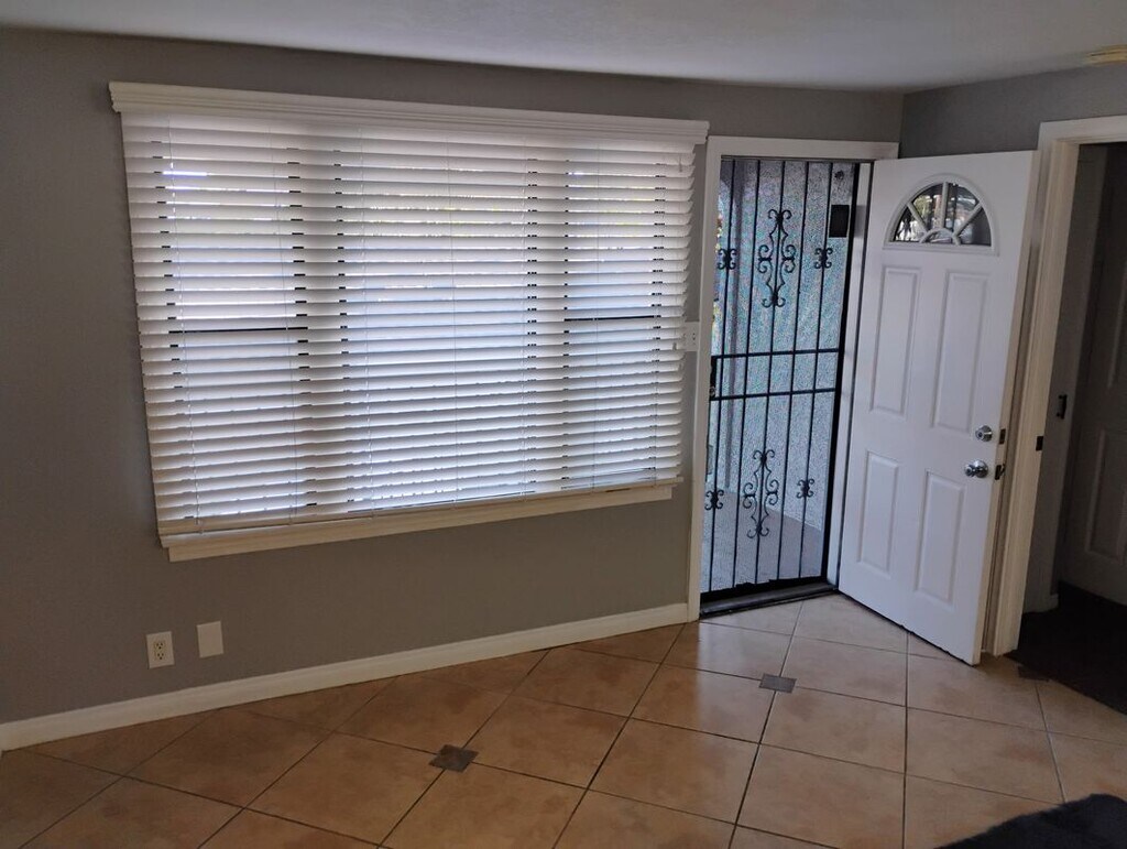 Quaint unit fully renovated. Tasteful colors, with a Spanish flair, windows (with blinds)in every room allowing for natural light, large carpeted bedroom, modest bathroom with plenty of storage, large closet space, tiled front room with wall heater, tiled kitchen and dining room, with wall A/C, required appliances, modern overhead ceiling/light fan in the dining room. Spacious and inviting balcony with pull down sun shade. Large shared community space with large storage bin. Close to all you need. Very quiet area. No vouchers or co signers accepted.