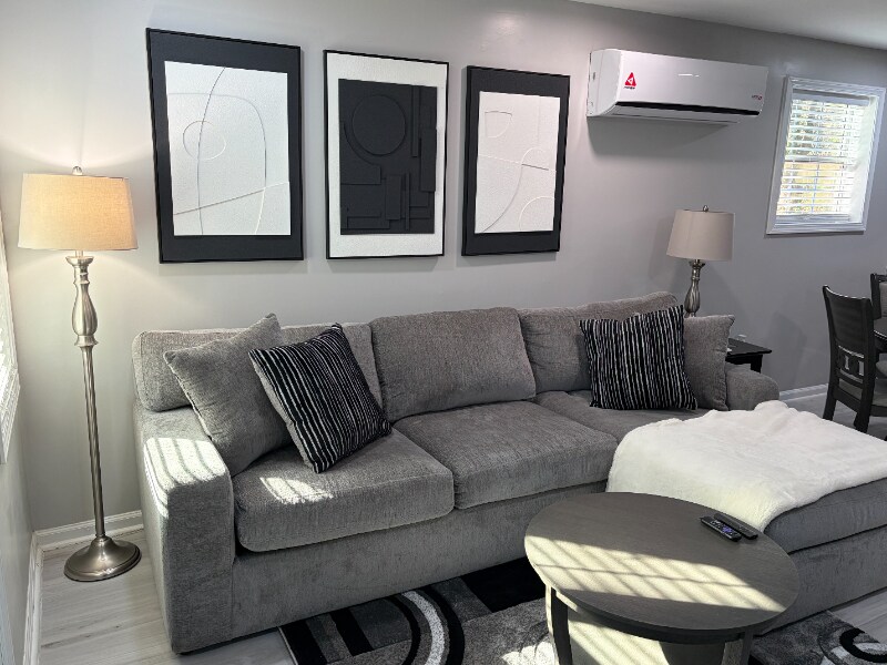 ID de propiedad: 550604 APARTAMENTO moderno totalmente amueblado recientemente renovado. Ubicado en el nivel inferior de una casa privada con una entrada lateral separada y cubierta cubierta. Amplia cocina de tamaño completo actualizada con varios electrodomésticos pequeños, como tostadora, tetera, cafetera, ollas, sartenes y platos, entre otros. Lavadora y secadora de tamaño completo. Incluye televisor de pantalla grande en la sala de estar. Gran luz natural desde las múltiples ventanas y puerta de privacidad mejorada.La iluminación de techo es un nuevo led blanco limpio. Unidad de aire separada. Nuevo patio cubierto con barbacoa y área de estar con vista a una tranquila área boscosa. Barrio tranquilo, a pasos de tiendas de comestibles, restaurantes y varios gimnasios pequeños. Ubicado al final de un cul-de-sac con estacionamiento frente a la casa. *Los servicios públicos están incluidos. ¡Esta es una joya inesperada!