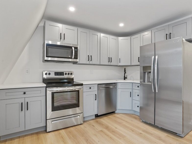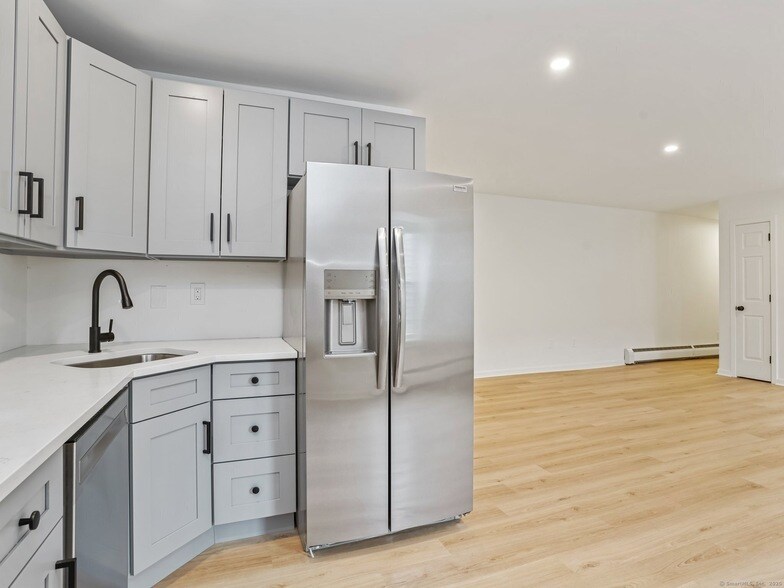 Fully renovated 2 BR 1 BA apartment. Living room opens to an eat-in kitchen. New kitchen with quartz countertops and stainless steel appliances. Newly renovated bathroom with shower/tub. New floors throughout the apartment. Brand new washer and dryer in unit. 1 outdoor assigned parking spot. Located minutes from Stamford Train station, downtown Stamford, and tons of shops/restaurants. Unit is a mirror image from the photos with white cabinets