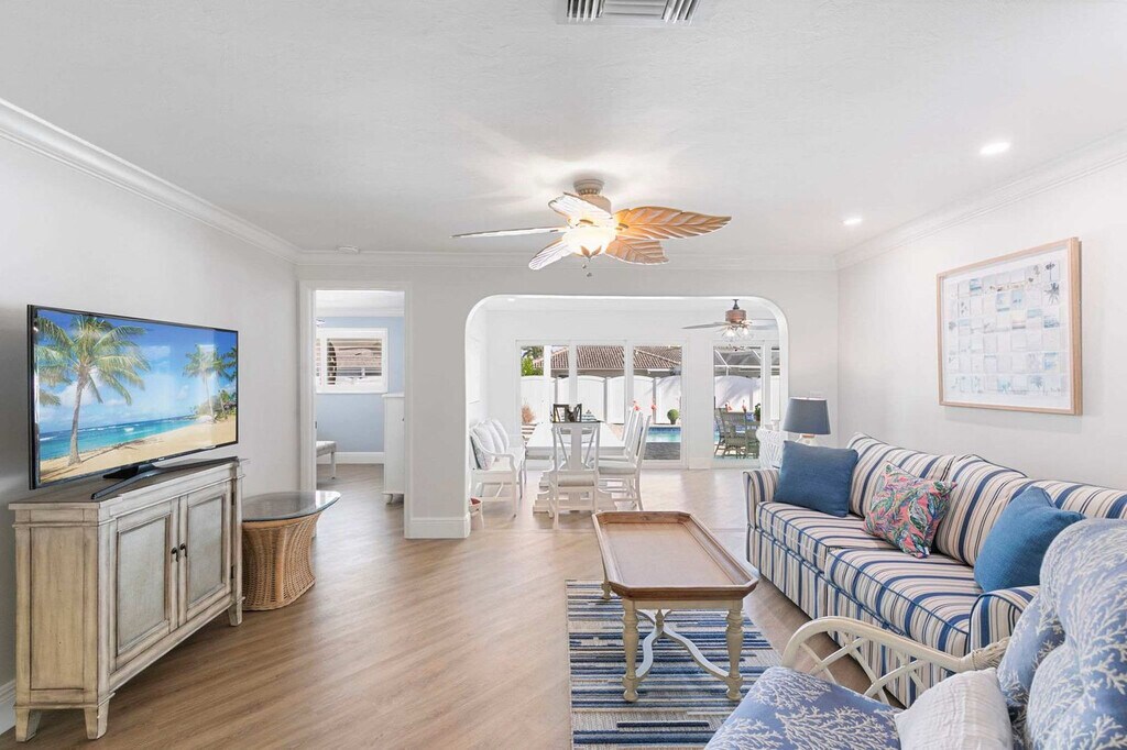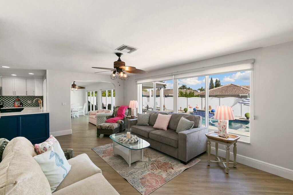 Your Marco Island retreat awaits in this beautifully appointed 3-bedroom home, just minutes from world-renowned beaches. Perfect for families seeking space and comfort, feel at home in this island oasis. Designed for family vacations, this home features a heated pool maintained at 85°F in season within a screened enclosure, a fully fenced backyard, a circular driveway, and an outdoor BBQ grill with a seating area. Beach-ready amenities include six adult bikes with helmets, multiple beach chairs, a large beach umbrella, plenty of beach towels, a beach wagon, beach toys, and a cooler. Modern amenities include central air conditioning, a cozy electric fireplace, a full-size washer and dryer, a fully equipped kitchen, and a smart TV with cable and streaming. Garage parking and driveway space are available. Step outside and discover Mackle Park, featuring a 10-acre lake with a fishing pier, a dog park, a modern playground, scenic walking paths, tennis and basketball courts, bocce ball courts, and a splash pad. You're within walking distance of charter fishing operators, golf cart rentals, Starbucks, Dunkin' Donuts, Publix, CVS, and multiple restaurants. The home is one mile from Marco Island's main beach access, two miles from Tigertail Beach, and six miles from Marco Walk Plaza. Southwest Florida International Airport is 40 miles away. Maximum occupancy is 11 guests and quiet hours are from 10:00 PM to 8:00 AM per Marco Island ordinance. There is no smoking allowed indoors or outdoors and no pets are permitted. Three exterior security cameras monitor the driveway and yard perimeter for vehicle and property security. There are no interior cameras. Includes high-speed Wi-Fi, a copier, and a scanner in the home office area. [SI]