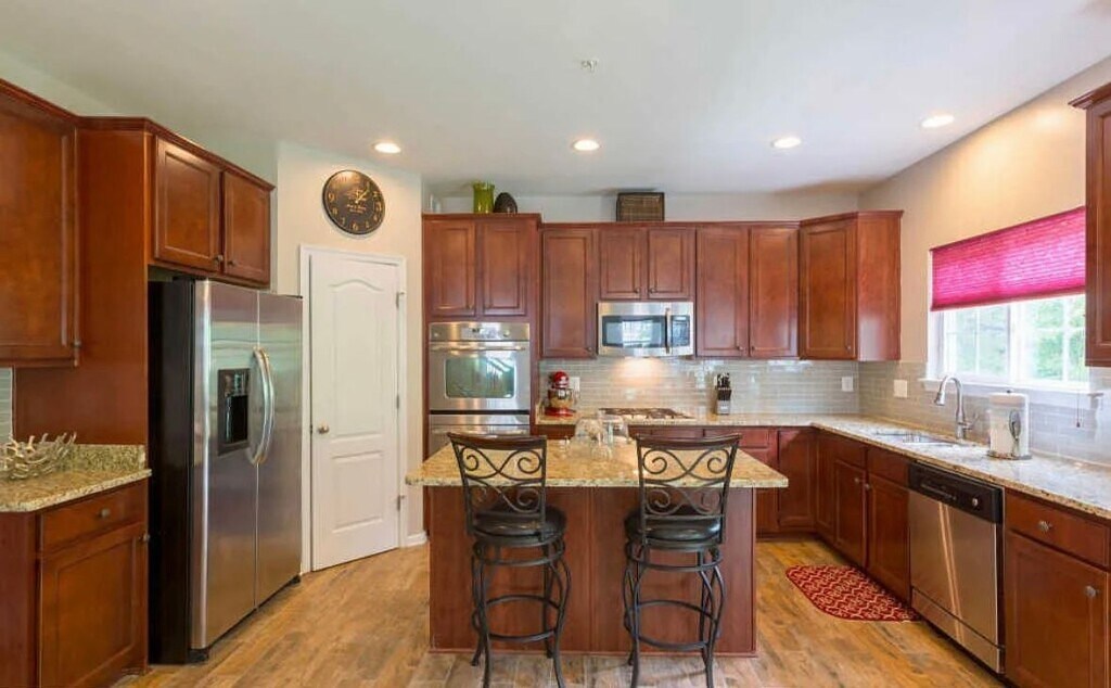 Beautifully updated 5-bedroom, 3.5-bath colonial featuring fresh paint, brand-new carpet, and numerous upgrades throughout. The kitchen offers granite countertops, a custom backsplash, upgraded 42" cabinets, and stainless-steel appliances. Enjoy the cozy fireplace in the family room with ceiling fan on the main level. The laundry room features a new washer and dryer with overhead cabinetry for extra storage. The home has been professionally cleaned and power washed, including the deck and exterior. The finished walkout basement includes a bedroom, full bath, and plenty of storage. Hardwood floors flow through the foyer, dining room, and kitchen. Outside, you’ll find refreshed landscaping, new gravel under the deck, and a backyard perfect for entertaining. Conveniently located near shopping, dining, and major commuter routes, this move-in-ready home combines comfort, style, and convenience!