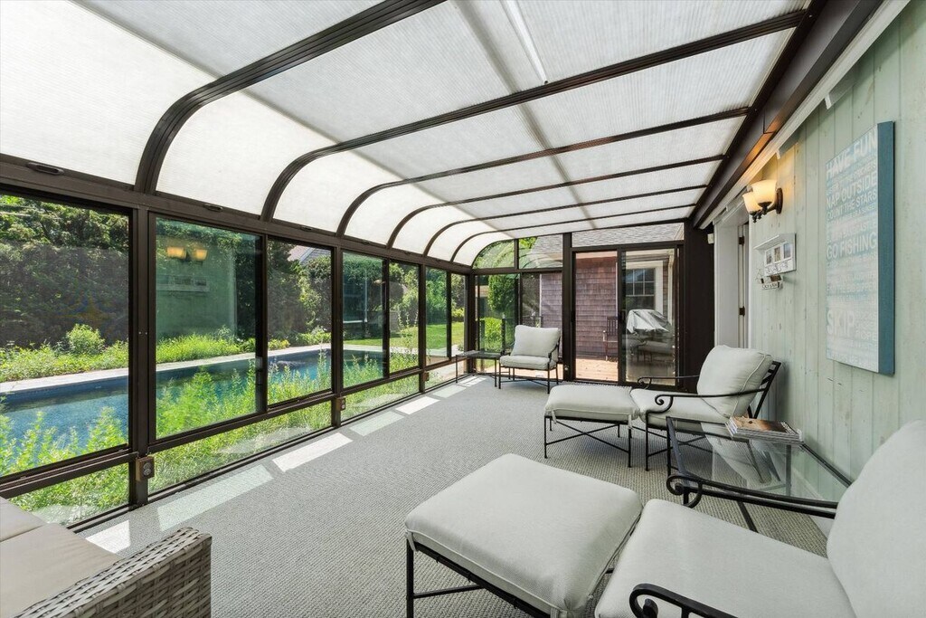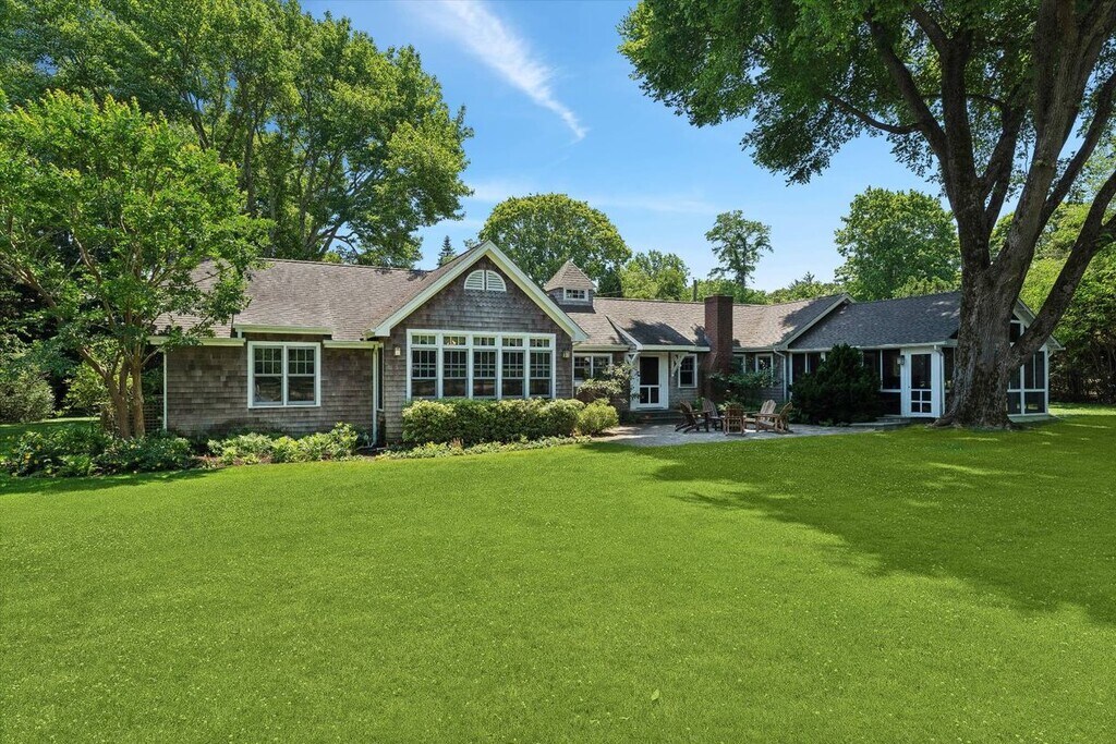 On a quiet lane in Quiogue, this 5 BR / 4 BR is the ideal summer retreat. Inside is an open kitchen, living room with fireplace, glassed-in sunroom, office with daybed, generous dining room, and four bedrooms including a master suite with a private screened-in porch. Outside there are beautiful gardens, wide lawns, a heated gunite pool, large screened in porch, and a pool/guest cottage with queen bed and bath. Basement level has ping-pong and kayaks ready for use at the nearby bay access point. Very close to the newly rebuilt Westhampton Beach Main Street and everything the village has to offer. [[Rental Registration # RP241549]]