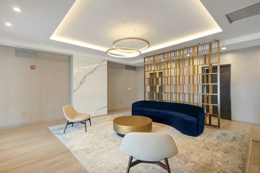 Welcome to this stunning, south-facing top-floor penthouse at the highly coveted 700 Grove. This expansive 2-bedroom, 2-bath residence (1BR + large den) offers 1,220 square feet of beautifully designed living space, complete with breathtaking NYC skyline views and a private balcony. Oversized windows flood the home with natural light, enhancing the open-concept living and dining areas perfect for both everyday living and entertaining. The chef s kitchen features brand-new granite countertops, a breakfast bar, full stainless-steel appliance package, and slate tile flooring. Rich hardwood floors throughout create a warm, seamless, and elevated aesthetic. The sun-filled primary suite boasts serene southern exposure, a spacious walk-in closet, and a spa-like en-suite bathroom with a soaking tub, separate shower, and dual marble vanities. The generously sized den, enclosed with French doors, easily functions as a second bedroom, guest suite, or home office and offers direct access to a stylish Jack-and-Jill full bath. Additional highlights include a brand-new premium washer/dryer and refrigerator. Rent includes heat, hot and cold water, cooking gas, high-speed internet, basic cable, and one full garage parking space, ensuring truly worry-free living. Residents of 700 Grove enjoy exceptional amenities including 24/7 doorman and concierge service, a fully equipped fitness center, resident lounge, beautifully landscaped upper and lower courtyards with BBQ grills, and a private shuttle to the Hoboken PATH. Perfectly located in the heart of Downtown Jersey City, just minutes from top restaurants, shopping, supermarkets, parks, major highways, and the Holland Tunnel. Available ASAP. Sorry no pets