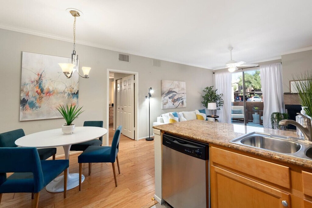 Feel at home in this beautiful, professionally staged condo in Scottsdale. This 700 sq ft condo offers a comfortable stay. The kitchen is fully stocked and equipped with appliances such as a microwave, fridge, stove, and dishwasher, along with glasses, mugs, dishes, and cutlery. Complimentary coffee, live TV, and fast Wi-Fi are provided. An in-house washer and dryer are included for your convenience. Secure single-car garage parking is available. The larger amenities like the pool, hot tub, pool table, and gym are shared. Enjoy easy access to all of Scottsdale from this centrally located condo. The pool, gym, pool table, hot tub, and some other amenities/areas are shared throughout all of the condos in the complex. Check-in time is not super flexible as you have to be let into the complex for the first time. After that, you will have key fobs to get in and out as needed. Profiles with a review rating lower than 4 stars will not be allowed to book this property on an instant book basis, and if for whatever reason the reservation confirms through the system, the reservation may be canceled. For guests with new profiles without reviews, these requests will be reviewed manually and will be subject to screening and questioning before a reservation may be confirmed. What guests love about this listing: professionally cleaned and sanitized space between each and every guest, a private condo and porch area, professionally decorated space with unique furnishings and a warm ambiance, and easy self-check-in via a secure door keypad. [SI]