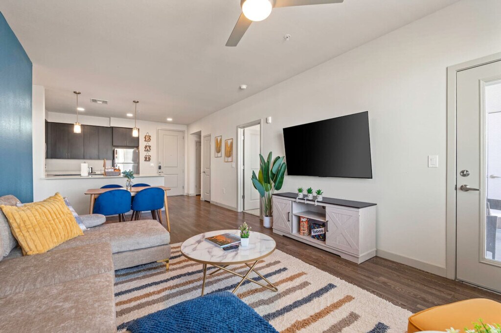 Feel at home in this 2-bedroom apartment that offers a perfect balance of luxury and comfort, located a few minutes from Tempe and ASU. Designed to serve a short getaway or a longer business trip, this apartment is fully stocked with items and amenities to cater to business travelers, families with children, and couples. It features a stylish living room with elevated ceilings, a smart TV, comfortable seating, board games, and a dedicated dining area. The fully stocked kitchen includes a coffee station, stainless steel appliances, and cooking supplies. Other notable amenities include in-unit laundry, reserved parking, EV car charging stations, outdoor BBQ grills, and a community lounge with a coffee bar. The apartment community offers resort-like amenities, including an exclusive pool, a state-of-the-art fitness center, a private patio overlooking the courtyard, and well-lit outdoor firepits and a dining area. Pamper your pooch in the on-site dog park and pet wash station. Located a few minutes from downtown Tempe and ASU, you can enjoy a day out with numerous highly rated restaurants, coffee shops, and grocery stores. It's a short drive to downtown Phoenix, Old Town Scottsdale, and PHX Sky Harbor Airport. Strict adherence to the policies is required, including no partying, smoking (of any kind), or community disturbance. Violators will be subject to a $500+ fine. Aggressive dog breeds or dogs weighing over 100 pounds are not allowed. Please respect the neighbors by keeping noise to a reasonable level inside the apartment and when using the shared amenities. Dedicated workspaces are available in each room with high-speed Wi-Fi. [SI]