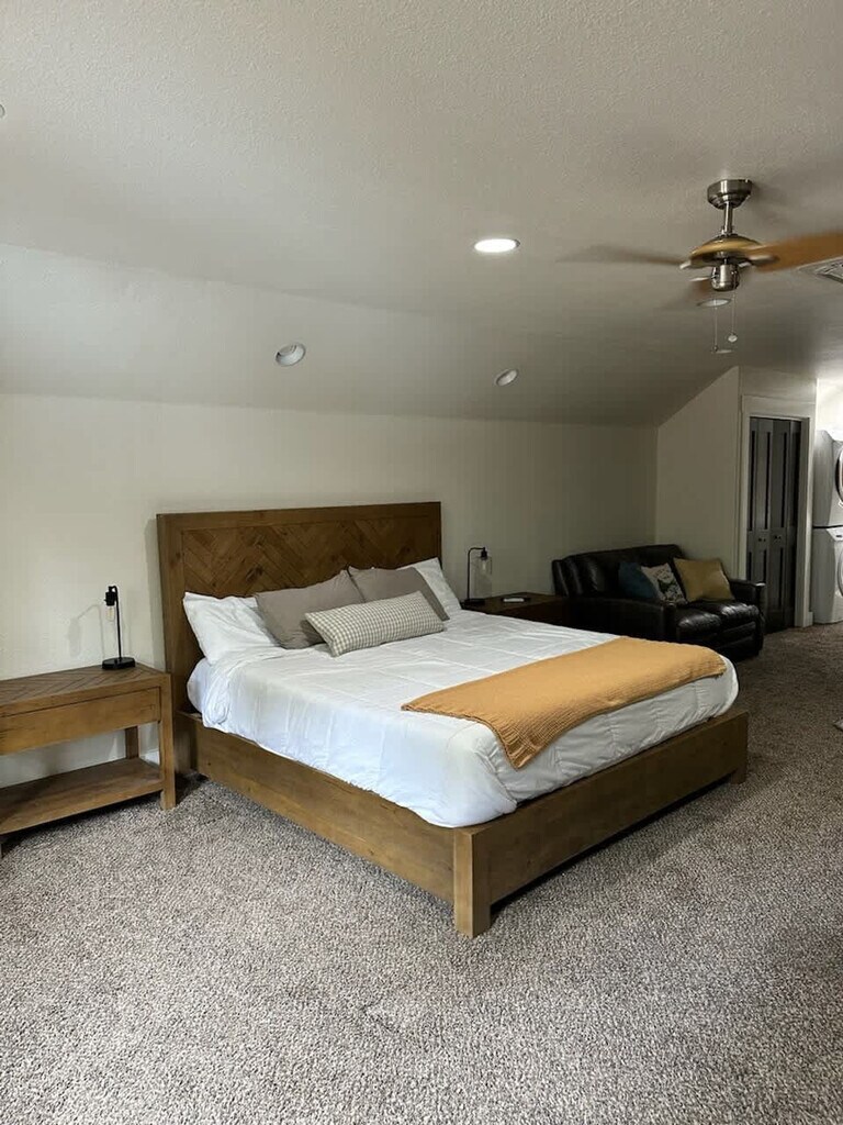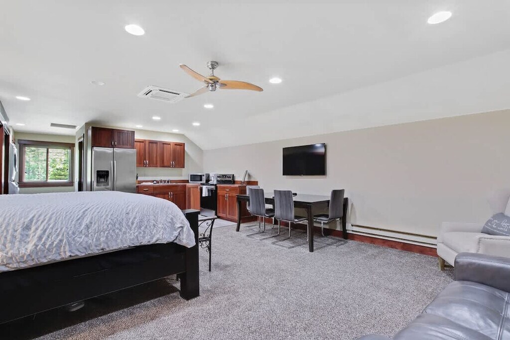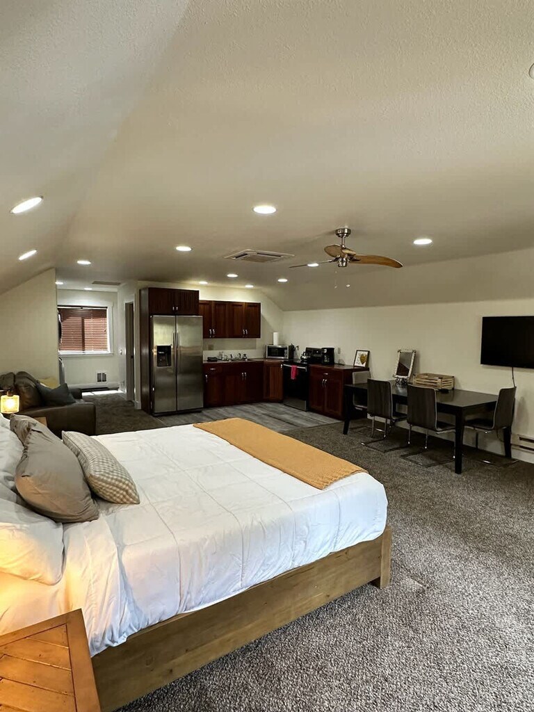 This spacious studio apartment is nestled against 43 undeveloped acres of walking trails and trees, offering a serene retreat. Situated within a short walking distance of Payette Lake and all the downtown shops and restaurants in McCall, this apartment is perfect for an individual traveler, a couple, or a couple with one or two children. The studio features a king-size bed with a sitting area, Wi-Fi, a smart TV for streaming, and a queen-size air mattress. Access to the studio apartment requires taking stairs. The apartment feels surprisingly cozy, spacious, and open, with stunning views that resemble paintings. Enjoy full access to everything within the studio, including a washer and dryer, a bathroom with a shower, towels, a first aid kit, and a hair dryer, as well as a fully equipped kitchen with all appliances and a comfortable living space. Please note, there is no garage access. Located in a quiet neighborhood with a mix of full-time neighbors and seasonal vacationers, this area offers a peaceful atmosphere. The walking trails behind the property are popular for jogging, biking, and dog walking during the warmer months. Getting around McCall is easy with McCall Transit, a free public transportation system that runs daily from 7 am to 7 pm, making stops at various locations including the courthouse, hospital, ice rink, and library. Guests are required to digitally agree and sign house rules and the rental agreement, which will be emailed once the booking is received. You can call, text, or message with any questions, concerns, or inquiries during your stay, at any time.