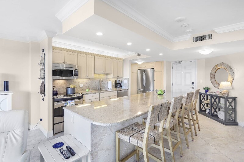 Property Id: 2069406 This beachfront condo on the 7th floor offers ocean views and accommodates four guests with one king bed and two twin beds, along with two bathrooms. The interior features coral-hued tile and a calming Island-style decor, with sliding glass doors that let in natural light and provide constant ocean views, complemented by colorful tropical flowers. The unit includes a spacious balcony for enjoying meals with a view of the sandy shoreline. The kitchen is equipped with modern appliances and has seating at the granite countertop, perfect for making tropical drinks to enjoy during sunset. Each bedroom has a TV and ample storage space. Amenities include air conditioning, heating, ceiling fans, free wi-fi, cable, and a washer and dryer. Additionally, the condo provides beach essentials like towels, chairs, a cooler, and an umbrella.