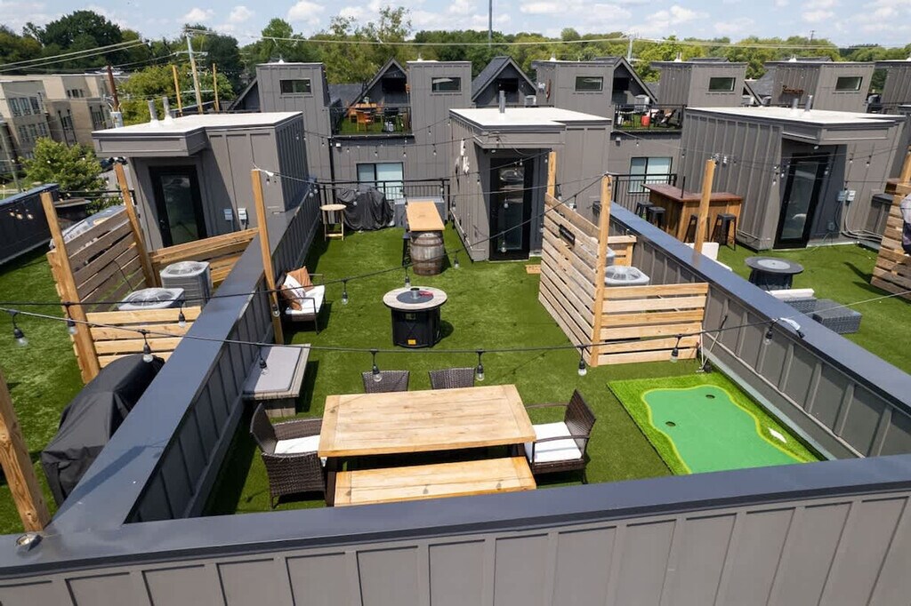 Feel at home in this stunning Nashville residence, The Wildwood June, offering ample space for large groups with subtle nods to iconic June Carter. Situated next to Southern Grist Brewing and across from Highland Yards, this home is just a 10-minute drive from Broadway. With four bedrooms, four baths, and a fully stocked kitchen with bar seating, this home is designed for comfort and convenience. Enjoy the spacious living area, smart TVs, Wi-Fi, and a two-car garage, along with a rooftop patio featuring a gas fire pit. This 2,000 sq ft home in East Nashville serves as the perfect base for your Music City adventure. Spanning four levels, the home includes four bedrooms with four full baths and a massive rooftop patio to enjoy city views. The kitchen, dining area, and living room are located on the second level, providing a central hub for relaxation and entertainment. The home also features a washer and dryer for your convenience. The property includes a two-car garage for convenient parking. Enjoy the rooftop patio equipped with a BBQ grill, dining area, fire pit, mini golf, and bistro lighting, perfect for entertaining and relaxation. Nestled in the heart of East Nashville, this townhome offers a prime location for exploring the city. Just 4.2 miles from Broadway, it's a quick 10-minute drive to the vibrant Honky Tonks. Uber and Lyft are readily available for easy transportation. Nearby attractions include Southern Grist Brewery, Highland Yard, and a variety of local restaurants and cafes. The home is conveniently located next to active train tracks, with trains passing by a few times during the day and night. The property is located next to active train tracks, with trains passing by several times during the day and night, which may cause some noise. Guests are required to sign a rental agreement, and the minimum age to rent is 18 years old. Smoking and parties are not allowed on the premises. [SI]