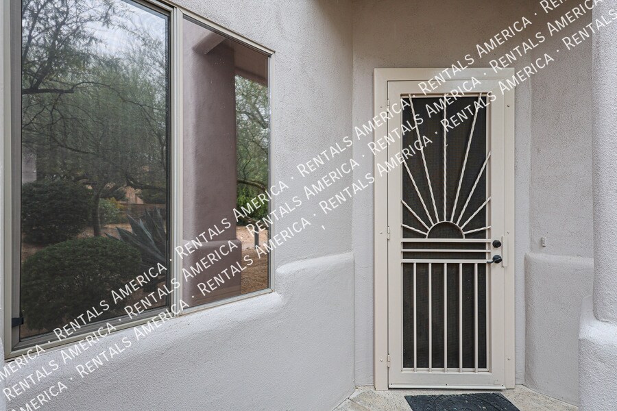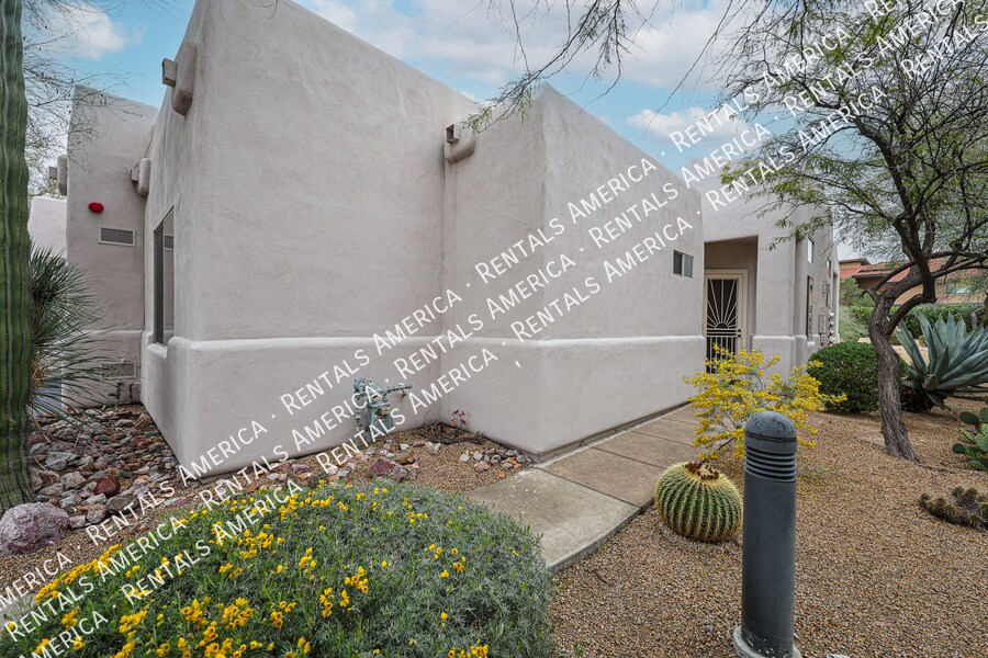 Half off your next full months rent when a 12 mos. lease begins before 4/15/2026. Fantastic 2 bedroom 2 bath condo in a prime location! Gated community and lovely mountain views from this corner unit. Overlooks a common area and near its community pool and spa. Newer bike lanes one block from the Condo and easy walk into town. Fresh interior paint and new carpet in guest room and primary closet. Extended 10 ft ceilings, ceiling fans, plantation shutters, wood flooring and tile in main living areas. Gas fireplace in cozy living room, additional office or den, and dining area opens out to covered patio. Split bedroom layout, both with large wardrobe closets. Primary room offers second private patio and an exquisite bathroom ensuite with dual sinks and oversized custom shower. Kitchen boasts breakfast bar, granite counters, and SS appliances include stylish LG Refrigerator, and 5 burner gas range and built in microwave. Laundry room has full sized washer dryer and upper cabinets. 2 car garage and easy walk to Carefree Town Center, Sun Dial and Historic Spanish Village. Tour this Arroyo Montana condo and apply today! One Time Admin Fee: $300, Pet Deposit: $300/pet (if applicable), Service Fee: 2%. $39/month Resident Benefits Package, Helping Heroes Discount Available! Carpet Disposal Dryer Garage Hardwood No Pets Allowed Views Washer