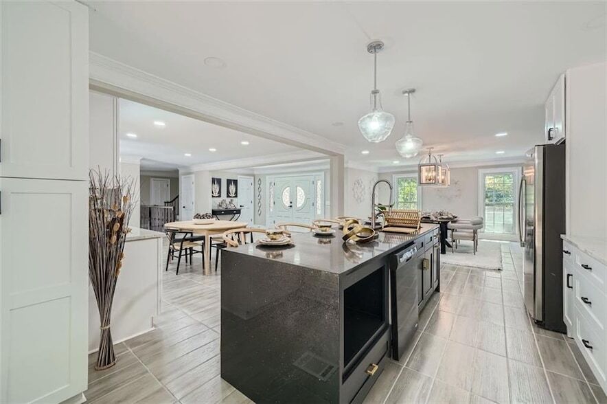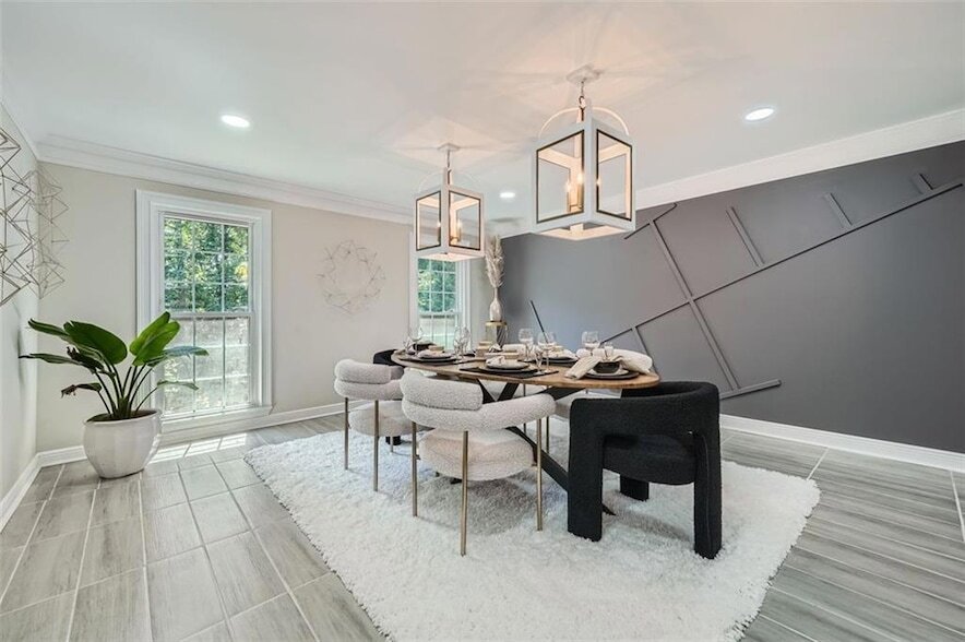 Spacious, renovated 4-bedroom, with a separate home Office, 6-bath French Chateau behind Dunwoody Country Club in Sandy Springs, facing the green. The all-new kitchen features granite countertops, an island, stainless steel appliances, a gas cooktop, and custom cabinets. Three enormous bedrooms each have a private bath, with two additional bedrooms sharing a renovated hall bath. The formal sunken living room boasts a velvet blue sectional a large TV Screen to view your family movies and a stately two-story, floor-to-ceiling fireplace. The master suite on the main floor and a larger master on the second floor both have balconies. The yard is fenced front and back with a gated entrance. This unique property features extensive landscaping, gardening, and many flowering plants and trees. Enjoy privacy and a view of the Dunwoody golf course pond in winter.