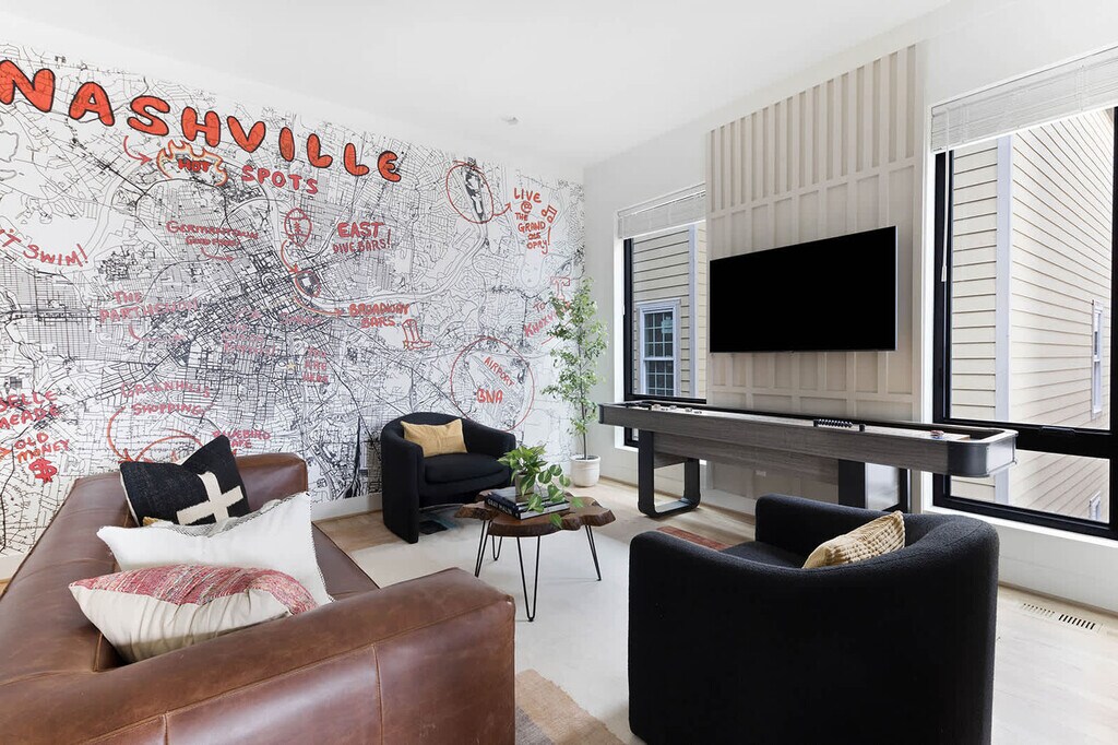 Welcome to The Acoustic and The Banjo at Lynwood Row, two thoughtfully designed, semi-attached retreats perfect for group getaways, family gatherings, or work trips. These homes combine comfort, style, and convenience in one seamless stay, centrally located in the heart of Nashville. You'll love the expansive rooftops with cozy lounges featuring firepits, dining areas, and a variety of games. Each bedroom has an ensuite bathroom, and the top-of-the-line kitchens are perfect for exquisite meals. Enjoy smart TVs in every room with access to various streaming services, cozy living rooms with shuffleboards, and high-speed Wi-Fi. Each home includes a laundry with a washer and dryer. To further elevate your stay, a variety of experience add-ons are available, including early check-ins and late check-outs, private chefs, in-home massages, and in-home yoga sessions. Nestled at the crossroads of the vibrant Wedgewood Houston and Edgewood neighborhoods, The Lynwood offers easy access to everything Nashville has to offer within a 10-minute radius. One of Nashville’s top bakeries, Baked on 8th, is steps away, and numerous fantastic restaurants, bars, and boutiques are within a short drive or a leisurely 10-15 minute stroll. Quiet hours are from 10 p.m. to 8 a.m. Renters must be at least 21 years of age, and guests under the minimum age must be accompanied by a parent or legal guardian. The property shall not be used by more than the number of adults and children listed in your reservation. Pets are not permitted, and no smoking is allowed on the property, including porches, decks, or outdoor areas, at any time. All guests shall not engage in illegal activity. There will be an additional cleaning fee of up to $500 for violations of the house rules or for excessive cleaning required. Registration Number: + [SI]