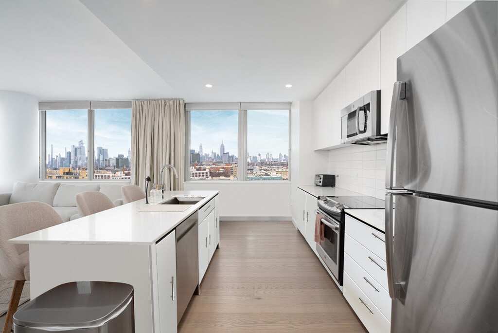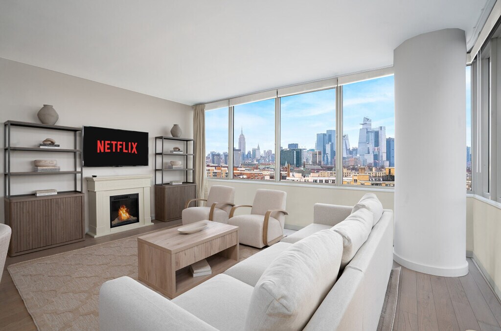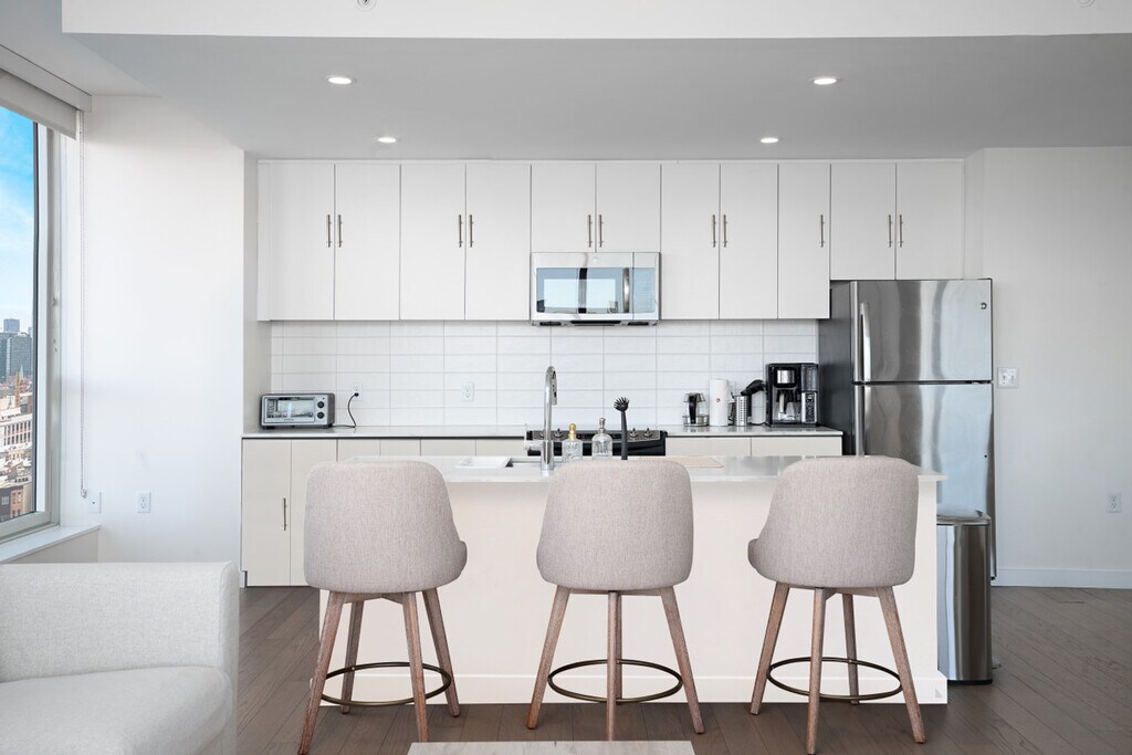 Welcome to this professionally designed, hotel-style apartment in downtown Hoboken, where panoramic views of the Manhattan skyline meet unparalleled comfort. With quick and easy access to NYC and downtown Hoboken, you're perfectly positioned to explore all that this bustling area has to offer. Bask in the natural light streaming through expansive floor-to-ceiling windows that showcase breathtaking vistas of New York City from every angle. Prepare gourmet meals in the fully equipped kitchen, featuring sleek stainless steel GE appliances, quartz countertops, and everything you need for a chef's touch. Relax in the spacious living area adorned with luxurious furnishings, perfect for unwinding after a day in the city. Step outside and enjoy the best of Hoboken, with fine dining, vibrant nightlife, and boutique shopping just moments away. Need to head into Manhattan? A free daily shuttle to the PATH station ensures quick and seamless access to NYC. This apartment is a smoke-free environment. Smoking, of any kind, is not permitted within or outside of the suite, including balconies, patios, or common and parking areas. Any sign of smoking is a violation of the stay agreement, which may result in immediate termination and recovery fees beginning at $500. Check-in is at 4 PM and check-out is at 10 AM, with a $75 per hour late fee. There is a $200 penalty for removing smoke detectors and a $300 penalty for lost key fobs. No outside guests are allowed without permission. A valid photo ID is required to complete the booking. A maximum of two pets with a combined weight of 40 lbs is allowed, excluding Pit Bulls, Bull Mastiffs, and similar breeds. An additional pet fee based on stay length may be collected separately. A pet fee may be charged for guests traveling with an emotional support animal, and the presence of emotional support animals can be declined from stays. All guests will be asked to sign a rental usage agreement that governs the terms of the stay. By completing the reservation, you agree to be bound by the rental terms and conditions and acknowledge that you will be required to provide a copy of a valid government-issued ID and matching credit card prior to check-in. You may be asked to undergo a background check if mandated by the property management company or the building. [SI]