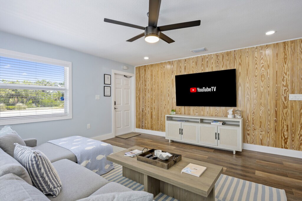 Welcome to The Shark Tank, the ultimate Cocoa Beach getaway! Feel at home in one of these four beach apartments, each with 2-bedrooms and 1-bathroom. Just a 5-minute walk (2 blocks) from the beach and downtown, this newly renovated quadplex offers all you need for an unforgettable Florida experience. Each unit features a fully equipped kitchen with an open floor plan overlooking the living room and a coffee bar. Enjoy access to 8 beach chairs, 4 beach umbrellas, beach wagons, beach toys, artificial turf, patio seating, a hammock, a surfboard shower, a giant connect 4, battle putt, and cornhole. Parking is available in the driveway for up to 4 cars. Located in the heart of Cocoa Beach, this is the only place in downtown Cocoa Beach with 8 bedrooms within a 5-minute walk to both downtown and the beach, perfect for large gatherings, including family reunions or company retreats. Centrally located near Kennedy Space Center and Port Canaveral, and just an hour from Orlando. Quiet hours are from 10 PM to 8 AM. Pets must be leashed at all times. Clean up after pets inside and outside. Do not leave pets alone in the house. One pet per unit is allowed. Guests are responsible for any pet damages or disturbances. Service animals are welcome; please notify us in advance. Report any breakages or damages immediately; additional charges may apply for damages. Smoking or vaping is prohibited inside or outside. Includes a dedicated workspace with a monitor and an HDMI cord. [SI]