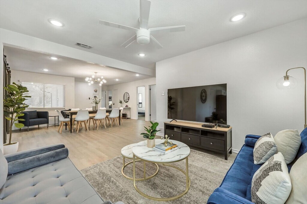 Feel at home in this stunning 4-bedroom, 2-bathroom home in a prime area, perfect for families or groups up to 10. This elegant retreat offers comfort, stylish finishes, and an entertainer-friendly design. This home caters to both short-term and medium-term stays and features a fully equipped kitchen with stainless steel appliances including an oven, fridge, freezer, stove, and microwave. Cooking essentials, place settings, and dining utensils are included. The dining area features a table that seats 8 comfortably and a cozy conversation nook for 2. The living area includes two plush couches, a coffee table, a media console, a flat-screen TV, and high-speed Wi-Fi. Enjoy the sparkling swimming pool, hammock, loungers, BBQ grill, and outdoor dining area in the fully fenced backyard. Free parking is available with a driveway and 2-car garage. North Richland Hills is consistently ranked as one of the best places to live in Texas, offering a dense suburban feel and convenient access to the Dallas-Fort Worth area. Explore local highlights such as the Iron Horse Golf Club, NRH2O Family Water Park, and Airborne Trampoline Park. Nearby DFW attractions include Six Flags Over Texas, CR Smith Museum, AT&T Stadium, and Dallas/Fort Worth International Airport. Smoking of any type is not allowed and violations are subject to a $450 fine plus the cost to clean, deodorize, and repair damages. We do not allow parties or large unauthorized gatherings. Pets should be discussed in advance; only house-trained pets are allowed and must be kept off beds and furniture, and pet cleaning fees will apply. Full disclosure of the number of people on the property at any time is required, with security camera verification to comply with local laws. Registration Number: SFRENT-0725-2556 [SI]