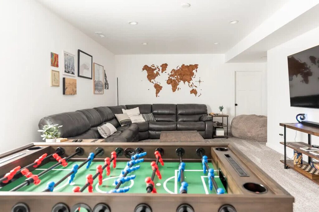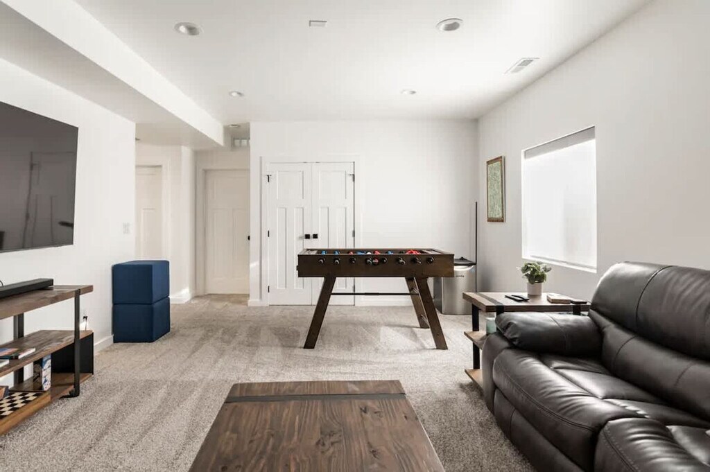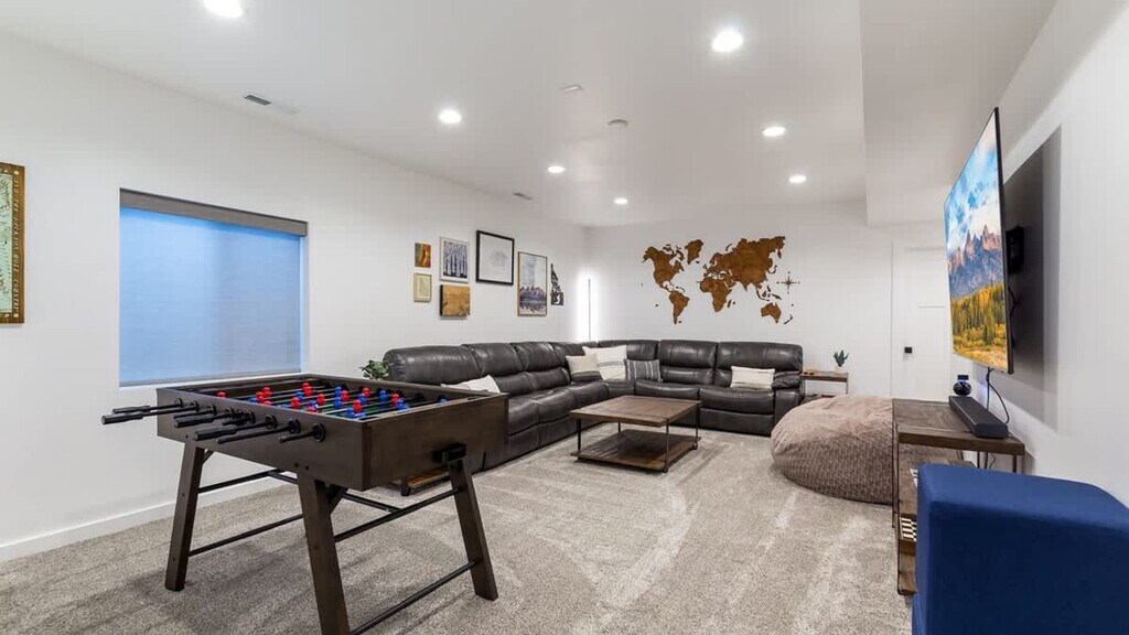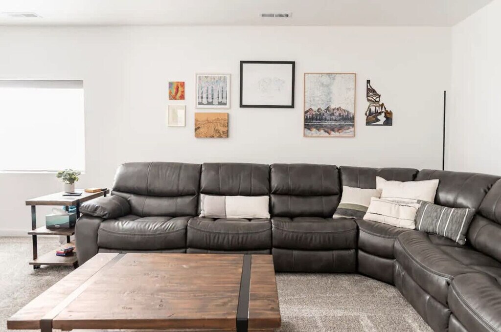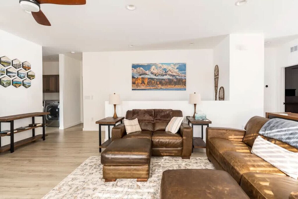 Discover the perfect basecamp for your Teton Valley adventures in this spacious 5-bedroom, 3-bath home. Feel at home with stunning views of Grand Targhee and the Teton mountains from the private hot tub. Conveniently located just outside Grand Teton and Yellowstone National Parks, this well-appointed home offers a secluded backyard with lovely park views and the Tetons as a backdrop. Just minutes from Ski Hill Rd, downtown Driggs, and Grand Targhee Resort, this home is ideally situated for both relaxation and adventure. Enjoy the private hot tub, garage and street parking, free fiber optic internet with Wi-Fi, and an EV charger. The home is fully furnished with high-end modern amenities, including device charging stations in every room. Two separate living areas with TVs and couches allow for flexible relaxation, and downstairs offers games and activities for everyone. The kitchen is fully equipped with stainless steel appliances, an electric range, a center island/breakfast bar, cooking essentials, and complimentary coffee and tea. Pets are welcome with a non-refundable $150 fee per pet, with a maximum of two pets allowed. The home offers an EV charger in the garage, and parking is available for up to four licensed vehicles in the driveway and garages. Additional accommodations may be available for larger groups in the adjacent home, owned separately. This home is ideally located near Grand Teton and Yellowstone National Parks, with easy access to Ski Hill Rd, downtown Driggs, and Grand Targhee Resort. Enjoy the quiet side of the Tetons with hiking and activities available in Teton Valley. Distances to nearby attractions include Yellowstone's West Entrance (1 hr 46 min), Grand Teton (57 min), and Grand Targhee Ski & Summer Resort (21 min). Regional airports are also conveniently accessible, with Idaho Falls, ID (1 hr 15 min) and Jackson, WY (1 hr 3 min) nearby. The property enforces quiet hours from 9 pm to 8 am and prohibits events, parties, and smoking or vaping in the home or on the decks. A minimum $500 fine applies for violations such as smoking in the house or garage, failure to follow house rules, or mistreatment of the hot tub. Pets are not allowed on furniture or bedding, and pet owners must pick up after their pets. The hot tub requires guests to shower before use, and additional cleaning fees may apply if not adhered to. Check-in and check-out are tech-enabled for your convenience. The home features a dedicated workspace with a desk and office chair in one of the bedrooms, and complimentary Wi-Fi is available throughout the property.