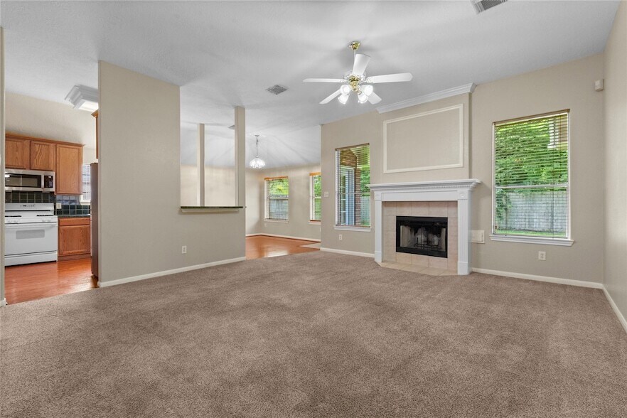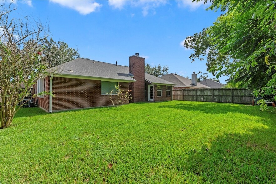 Charming home in the heart of League City - walking distance to the elementary school! This fully bricked three-bedroom, two-bath property now features brand-new carpet throughout, offering a fresh and comfortable feel the moment you walk in. The kitchen and dining area showcase beautiful wood flooring and open seamlessly to the spacious family room, complete with a cozy fireplace. The primary bedroom includes a full en-suite bathroom and a generous walk-in closet. Both secondary bedrooms also offer roomy closets for ample storage. Additional highlights include an indoor laundry room and a two-car garage. This home is exceptionally clean, well-maintained. Move-in ready and available immediately!
