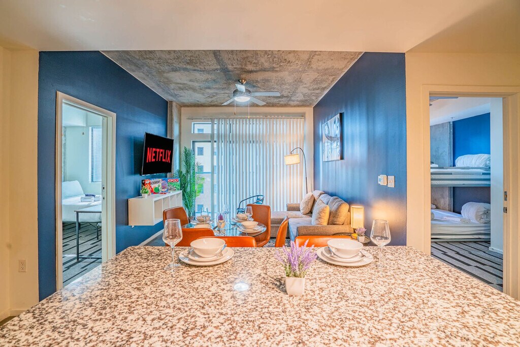 Live the lovely Phoenix life in this comfortable and modern apartment, strategically placed in a quiet neighborhood. Enjoy easy access to local attractions, including pubs, bars, restaurants, and businesses. After exploring the sights or handling business, return to this relaxing space for a stress-free rest. This 2-bedroom unit offers a socially and environmentally conscious living environment with top-notch customer service and unparalleled amenities. The innovative open-concept design seamlessly blends the living and dining areas with the fully equipped kitchen, creating a modern and sleek living experience. The living room is perfect for relaxing with friends and family, featuring a stylish interior and carefully chosen amenities, including a sofa bed and a 4K 55" HDR Smart TV. The kitchen is fully equipped with modern appliances, allowing you to prepare your favorite meals with ease. The apartment comes with one parking spot, and guests need to print their parking pass as detailed in the check-in instructions. Pets are allowed depending on size or if they are service animals, with an additional cleaning fee required per pet. There is a 2-pet maximum, and only cats and dogs are allowed. If pets are brought without prior notification, a $500 fee will be imposed. Early check-in/check-out may be available at a fee of $25 per hour, subject to scheduling. A $500 fee applies for lost or unreturned keys. Situated in a quiet neighborhood, this apartment provides easy access to local attractions, including pubs, bars, restaurants, and businesses, making it an ideal location for both leisure and business travelers. Noise monitors are installed to measure noise levels, and tampering with them will incur a fee. Security cameras are in the hallways for safety. Quiet hours are between 10pm and 8am daily, and violations may result in booking cancellation and removal from the property without refund. A strict no-party policy is enforced, with police involvement and removal from the property if violated. Smoking is prohibited on the property, including balconies, with a $500 fine for violations. Additional cleaning fees may apply if the property is left excessively dirty. Regular pest control is conducted, but occasional small bugs may be present due to seasonal changes. [SI]